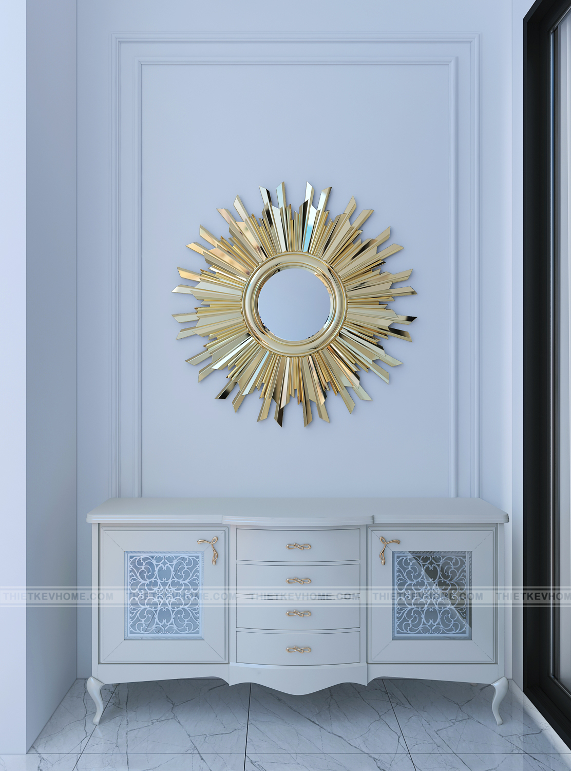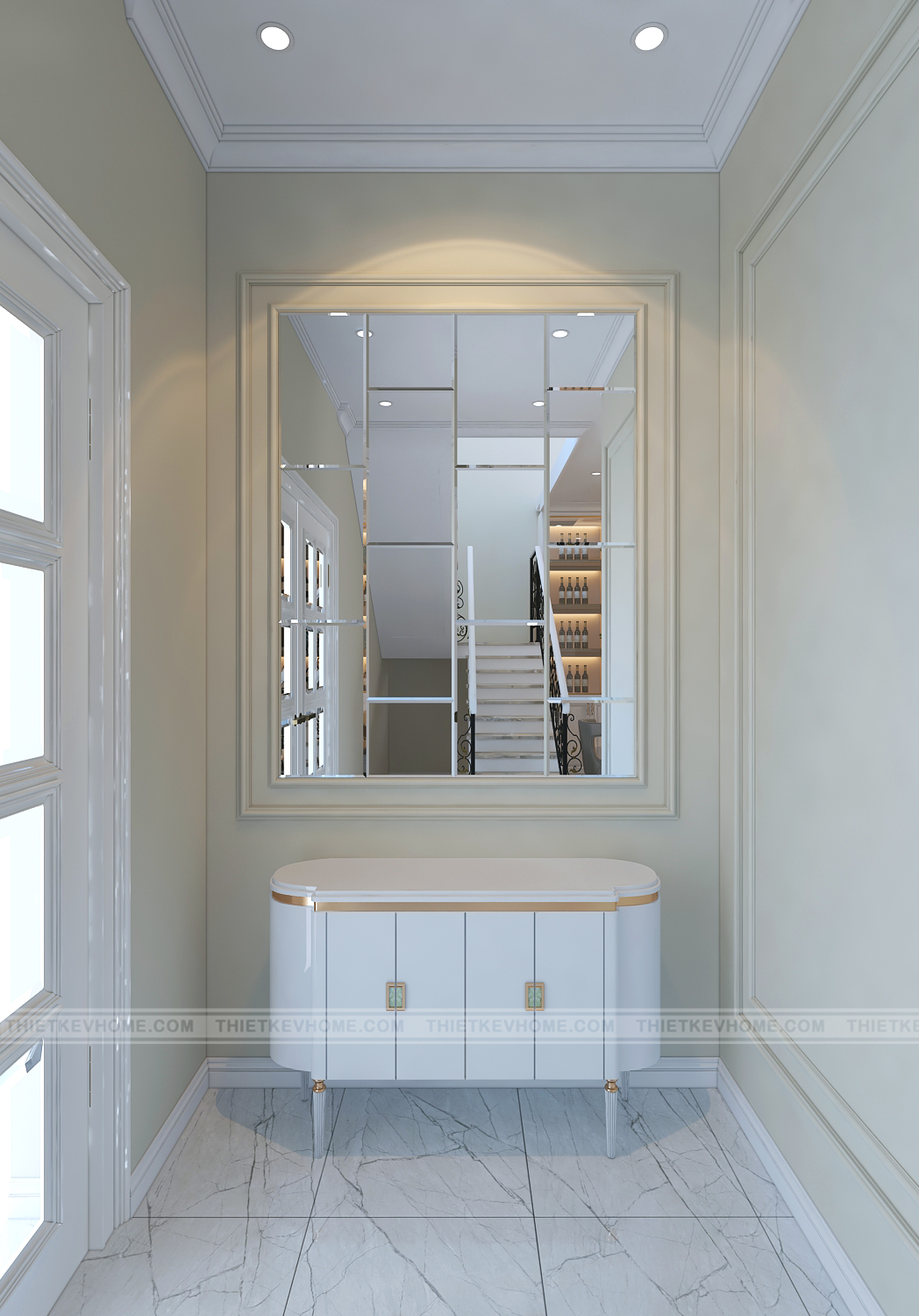 Thiết kế sảnh hàng lang với tủ trang trí và gương treo decor tạo điểm nhấn.