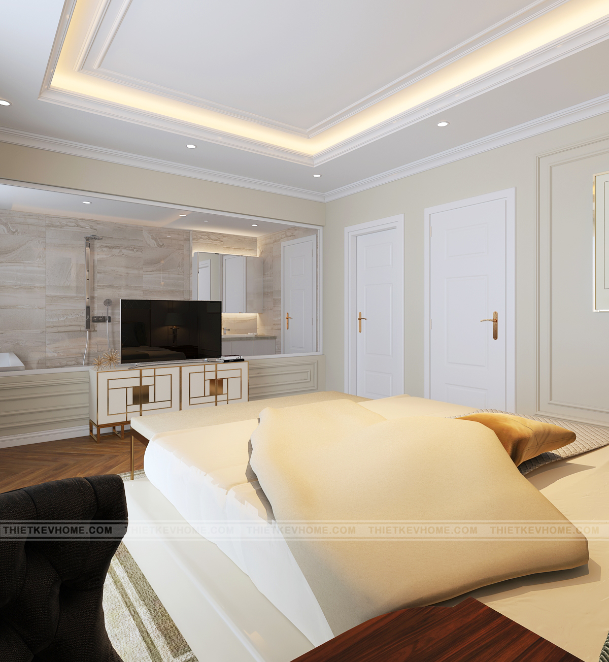 Thiết kế nội thất tầng 2 bao gồm: 01 phòng ngủ master có ban công và phòng wc riêng, phòng thay đồ liên thông với nhau. Phòng ngủ master được thiết kế đơn giản nhưng sang trọng. Ánh sáng màu vàng giúp không gian nội thất trở lên ấm ấp và gần gũi. Phòng ngủ và phòng wc được ngăn cách bởi vách kính cường lực như không gian khách sạn, mà giúp tình cảm vợ chồng thêm thắm đượm, gia tăng hạnh phúc gia đình.