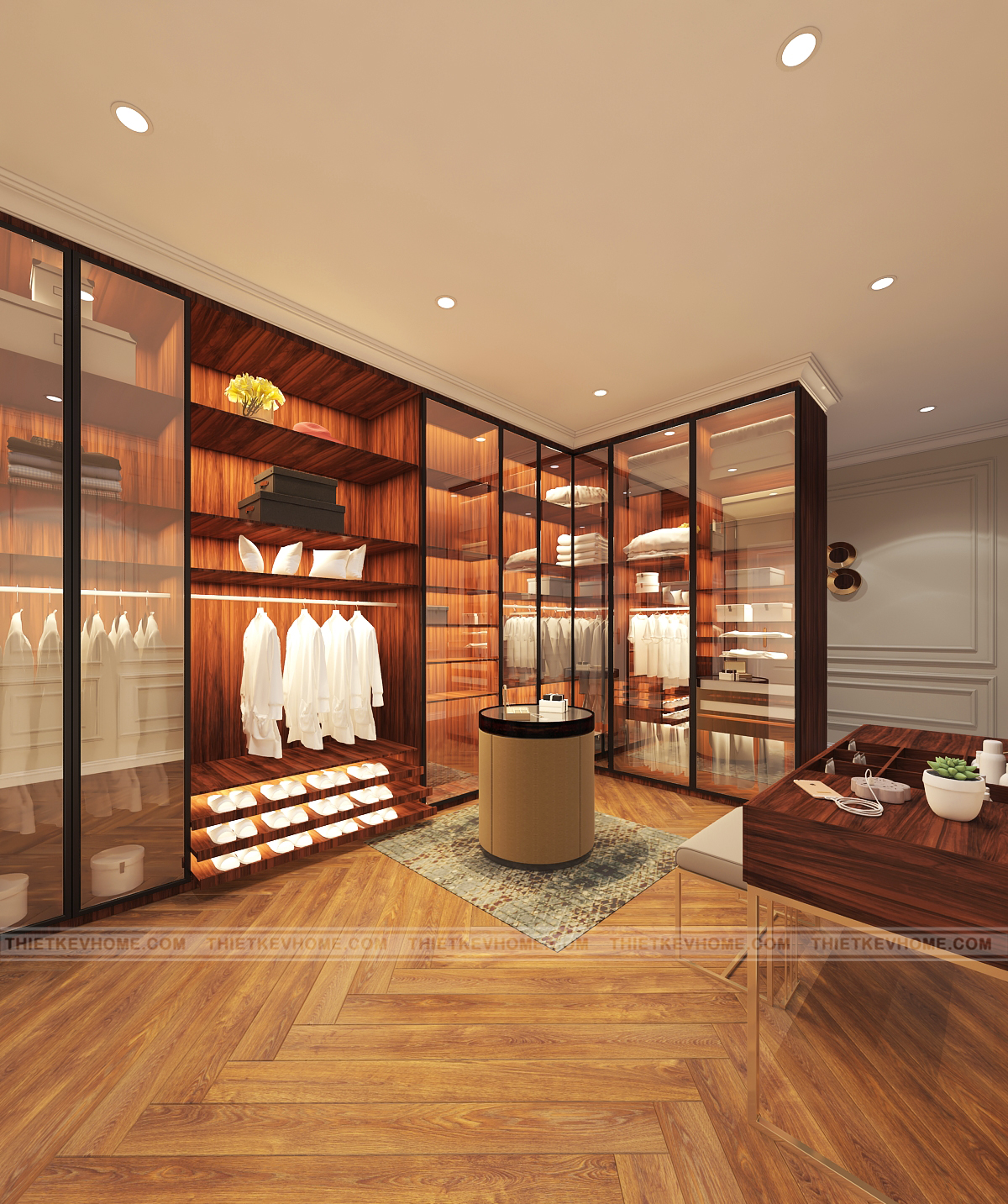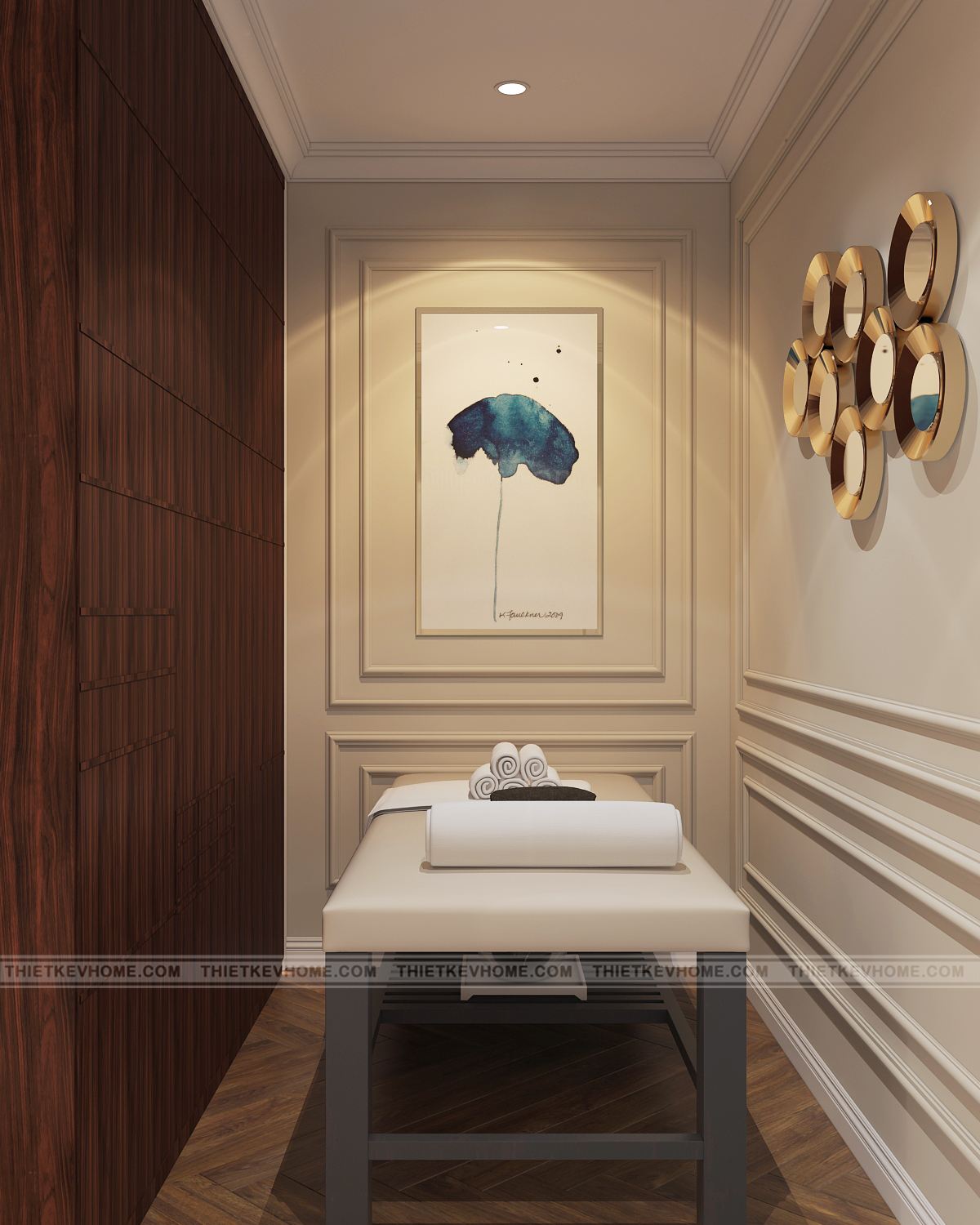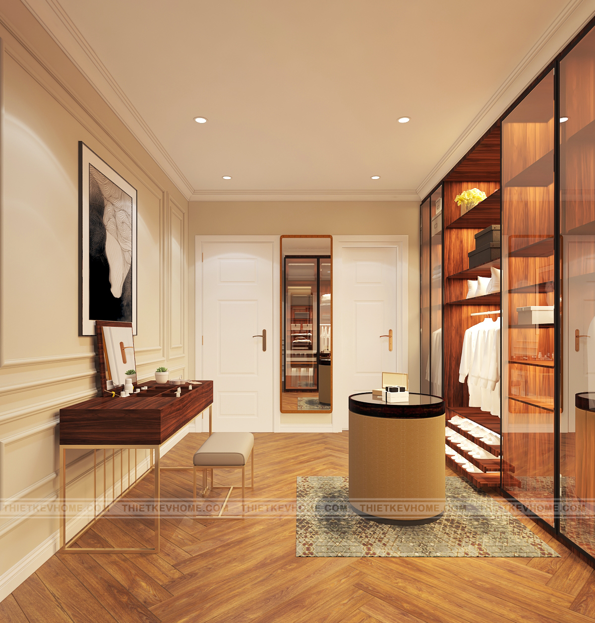 Thiết kế phòng thay đồ sang trọng với hệ tủ quần áo lớn, vân gỗ cánh kính. Tủ quần áo hình chữ U cung cấp lượng lưu trữ lớn, thoải mái cho chủ nhân của căn hộ. Đối diện là bàn trang điểm của nữ chủ nhân. Sau tủ quần áo là giường nằm massage.