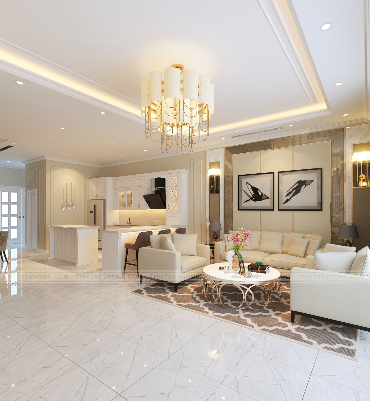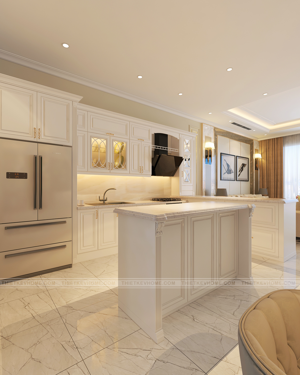 Thiết kế nội thát phòng bếp theo phong cách luxury sử dụng màu trắng chủ đạo, vừa lịch sự, vừa sang, vừa sạch sẽ. Nội thất phòng bếp chính là trái tim của ngôi nhà, là khu vực độc tôn của các chị em nội trợ, vì vậy kiến trúc sư thiết kế nội thất phải đảm bảo được nội thất phải đầy đủ công năng và tiện ích. Tủ bếp được thiết kế tạo điểm nhấn bởi các đường phào chỉ và nổi bật trên nền trắng là sự tinh xảo của các tay nắm bằng đồng.