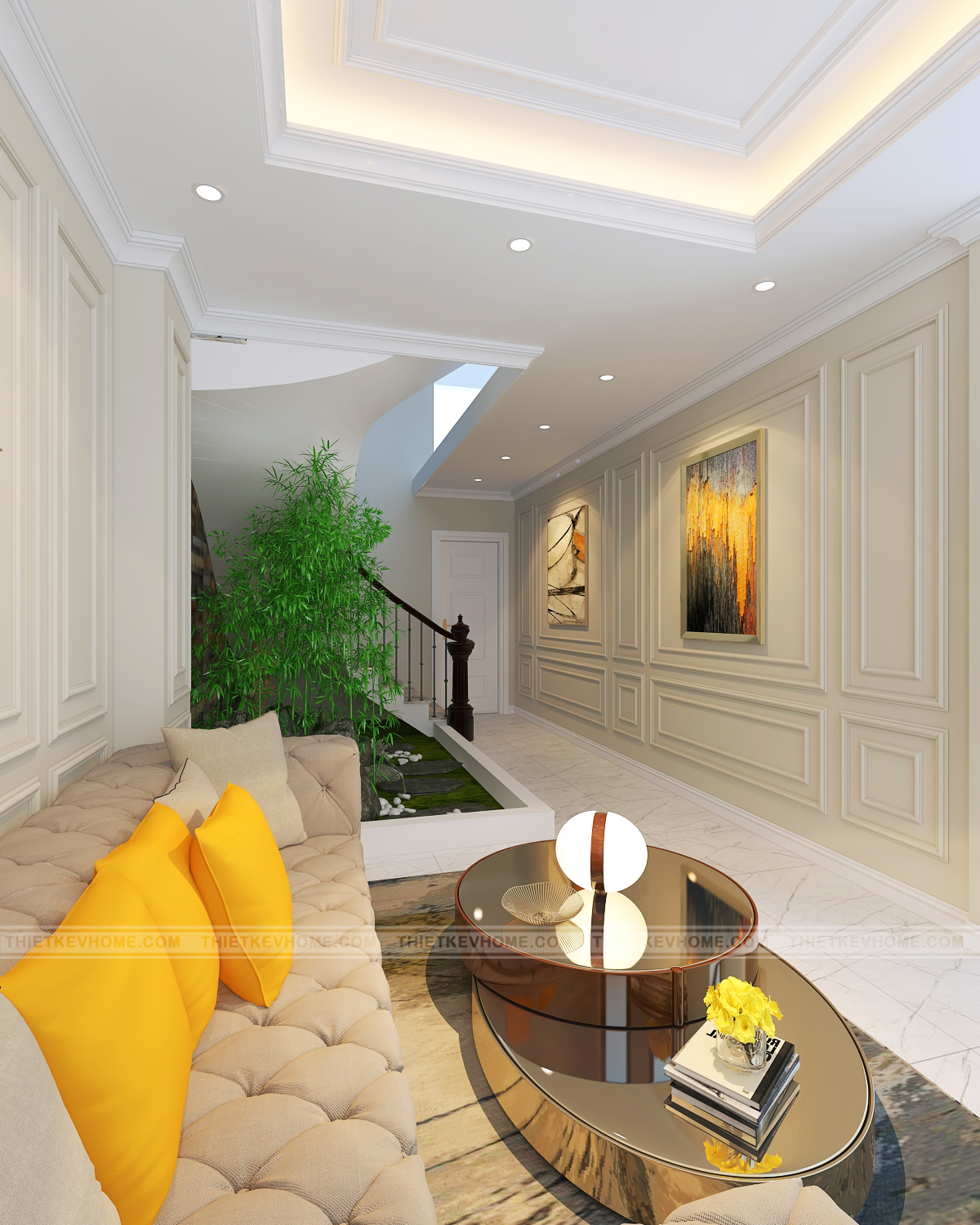 Nội thất phòng khách bếp được lát đá hoa cương đẹp và sang trọng. Không gian sinh hoạt chung khách hàng sử dụng lát đá, không lát sàn gỗ vì không gian bếp hay sử dụng nước nên hạn chế sử dụng sàn gỗ ở khu vực này, hơn nữa đá hoa cương luôn mang tới sự sạch sẽ và sang trọng cho các căn nhà phố. Nổi bật giữa không gian phòng khách là bộ sofa lớn, sang và đẳng cấp. Bộ sofa màu be mang tới cho không gian nội thất sự sang chảnh, tuy nhiên gia chủ cũng cần phải giữ gìn và vệ sinh thường xuyên. Vách ốp sau sofa kiến trúc sư sử dụng nẹp đồng trang trí tạo điểm nhấn cho không gian phòng khách, kết hợp với treo tranh trang trí trên vách ốp tạo hiệu ứng sang trọng.