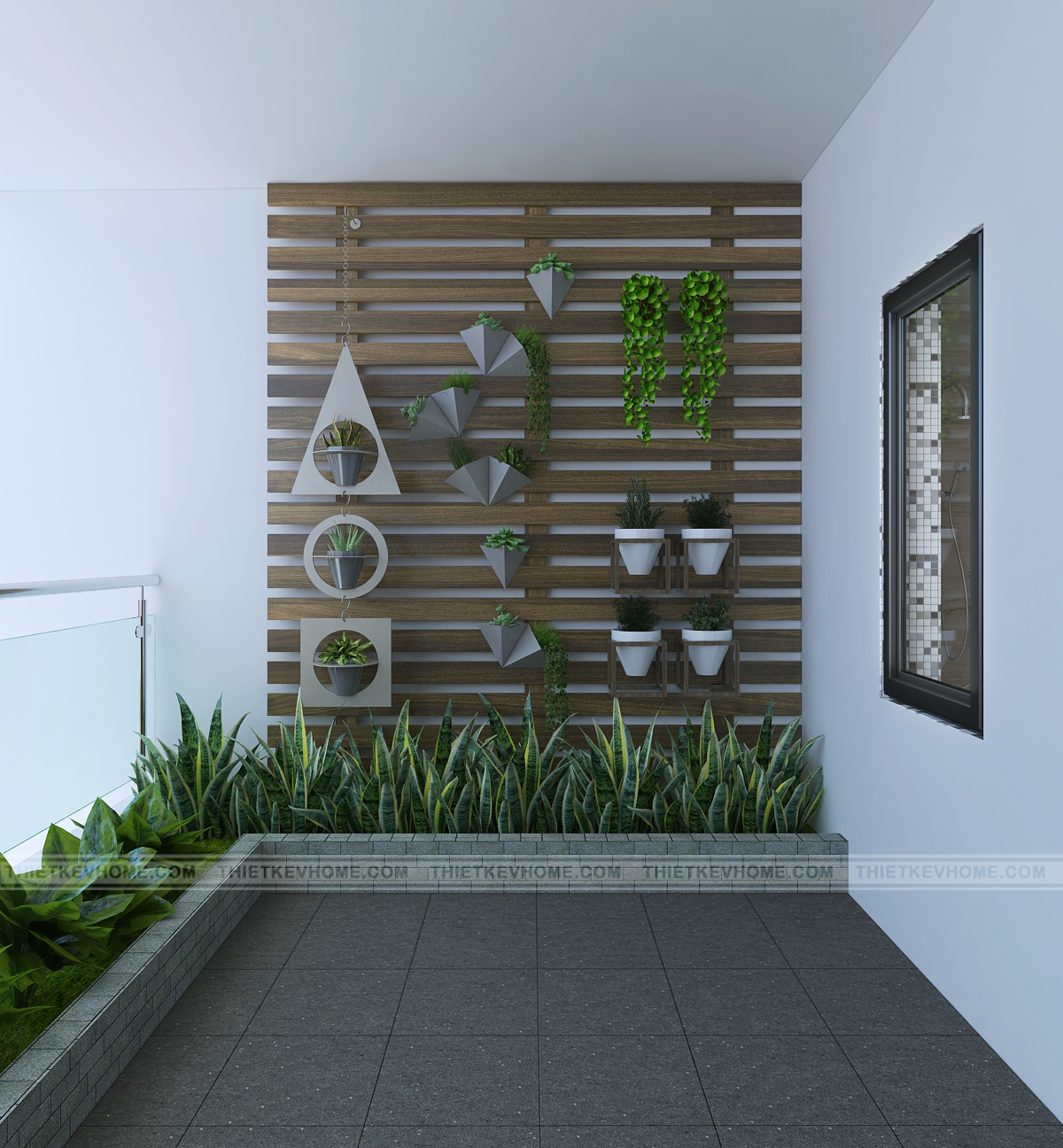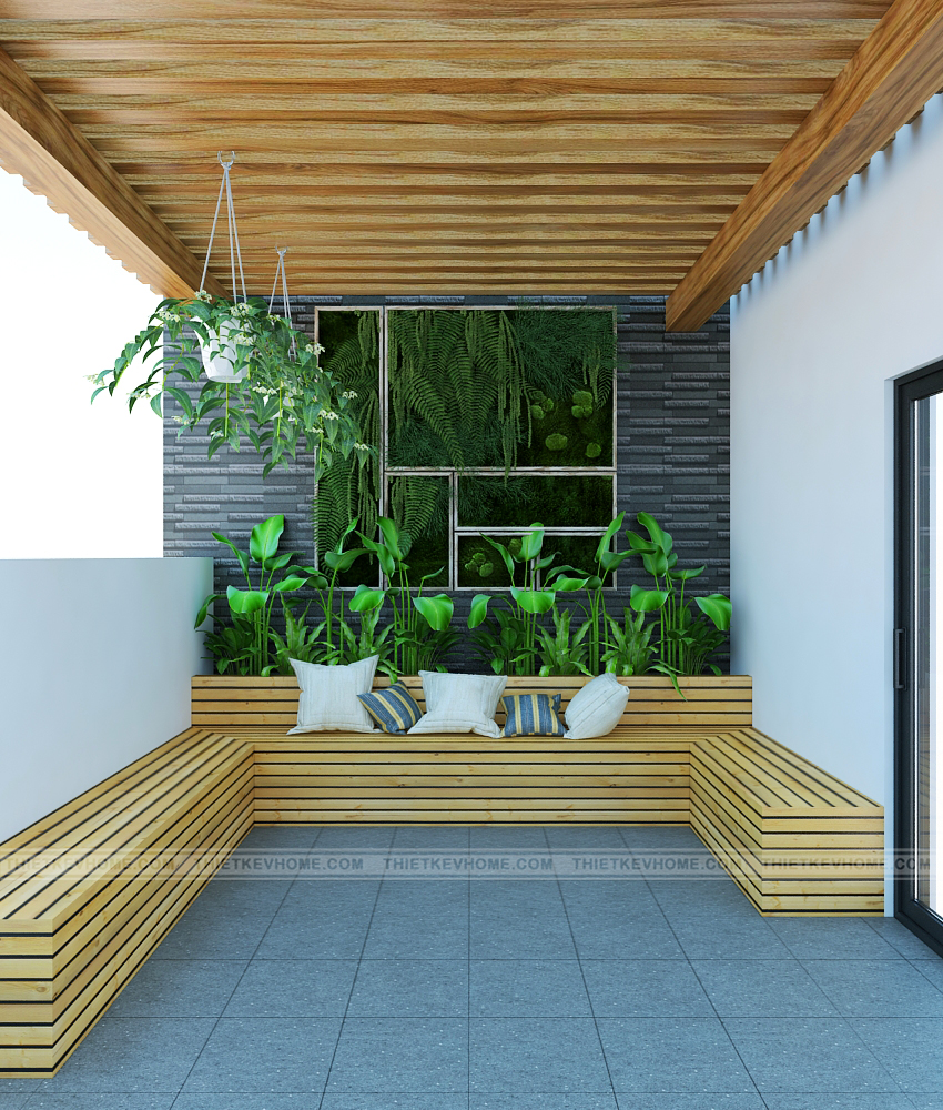 Thiết kế tầng thượng với lam gỗ tự nhiên treo cây cảnh và ghế ngồi ngoài trời giúp gia đình có thêm không gian để gắn kết các thành viên trong gia đì