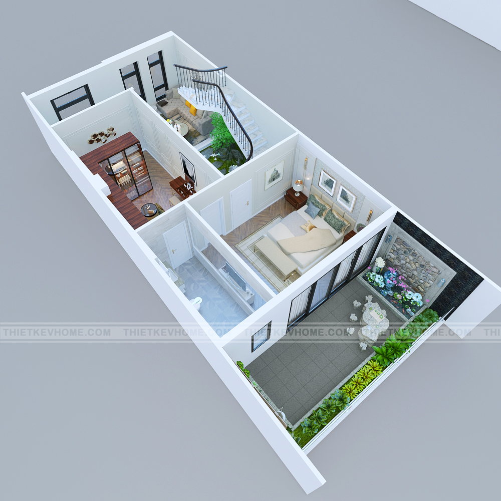 Thông thường thiết kế nội thất nhà phố, tầng 1 sẽ là không gian sinh hoạt chung của gia đình, đồng thời cũng là không gian tiếp khách, quảng giao. Còn các tầng trên sẽ các không gian chức năng. Với diện tích như nhà phố Lào Cai, kiến trúc sư V-Home đã thiết kế phòng khách và phòng bếp ở tầng 1, không gian chức năng không có sự ngăn cách, cầu thang ở phía cuối của ngôi nhà.
