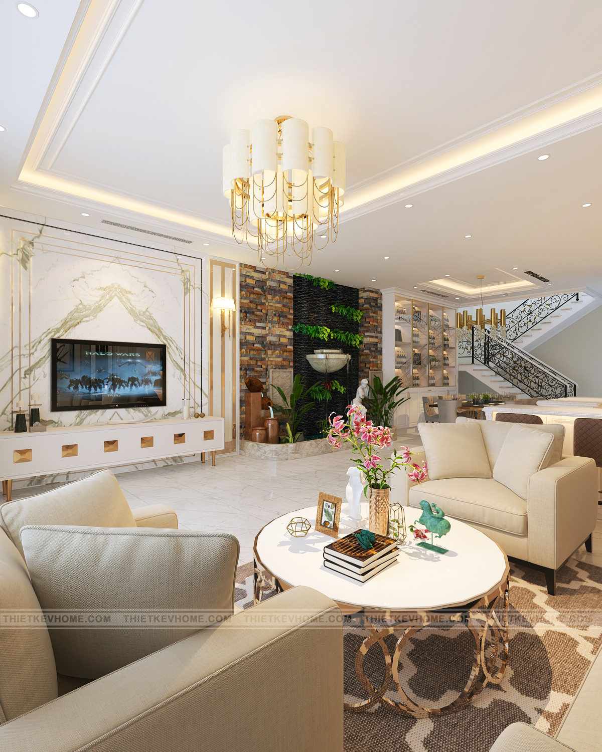 Không gian phòng khách được bố trí một chút tiểu cảnh mang tới sự thi vị, tràn trề nhựa sống cho ngôi nhà. Tiểu cảnh nước cũng giúp gia chủ thư thái hơn sau những ngày làm việc mệt mỏi. Trần thạch cao giật cấp kết hợp với đèn trần trang trí góp phần tăng vẻ đẹp cho không gian đặc biệt quan trọng này.