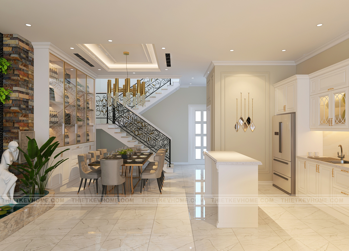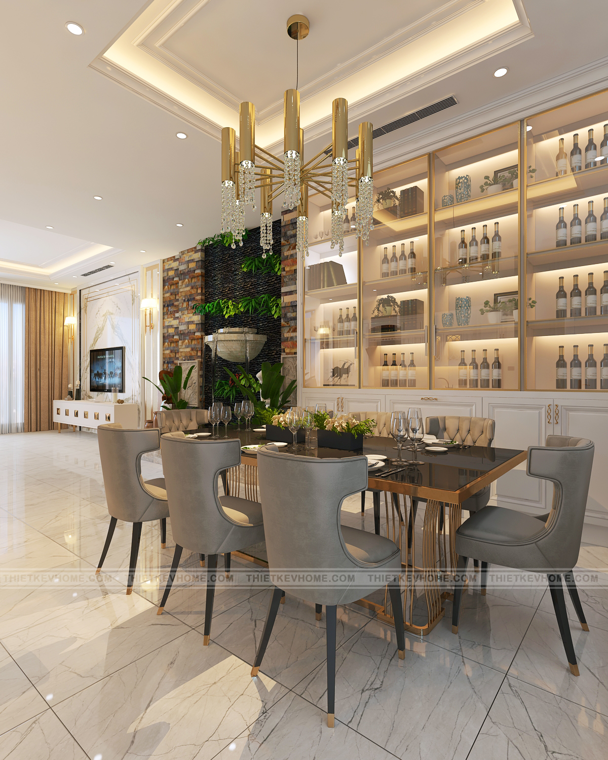 Trong phòng ăn có thiết kế tủ rượu cao sát trần. Tủ rượu được thiết kế cánh kính với hệ thống đèn led âm tủ tăng thêm sự sang trọng cho không gian nội thất phòng ăn.