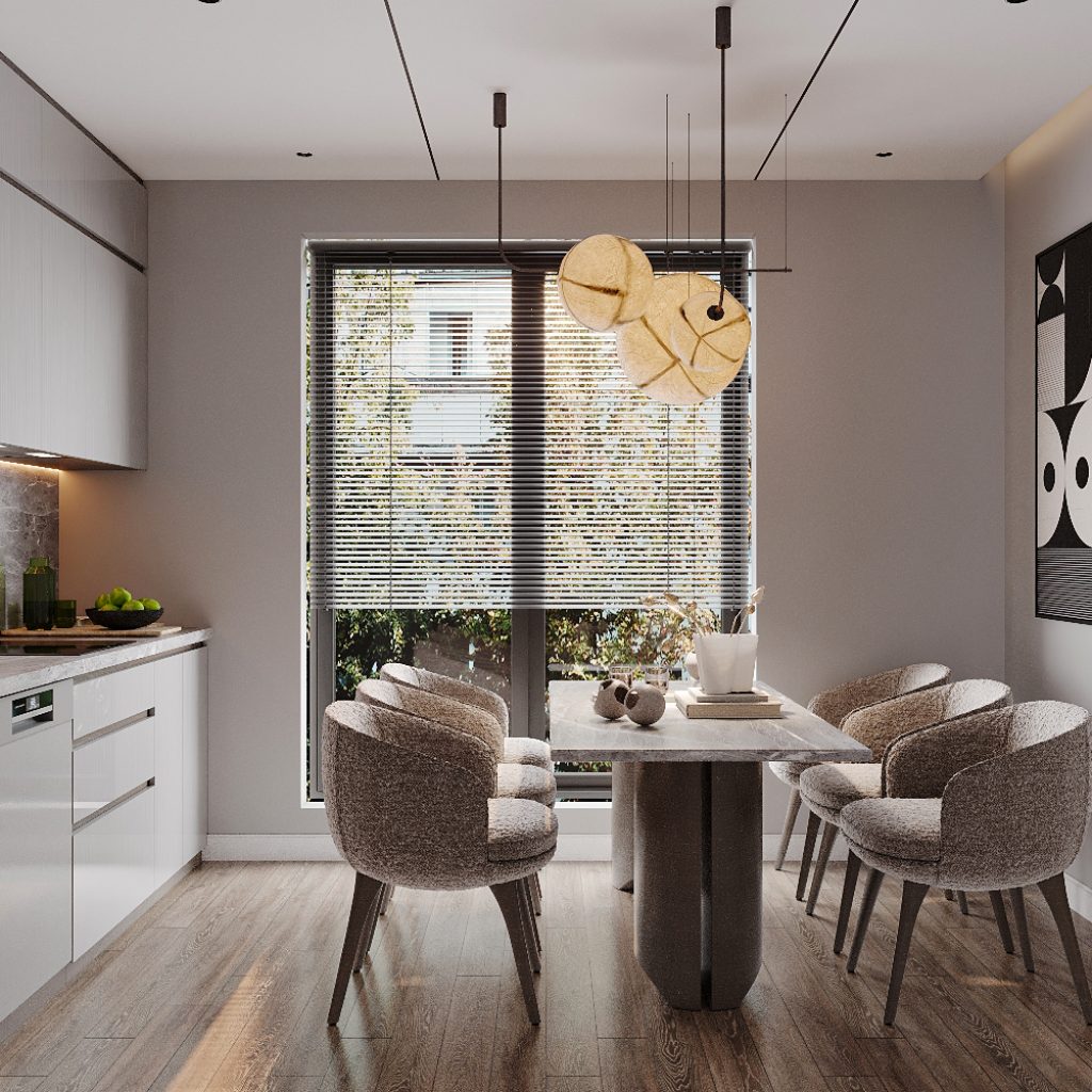 Với bố cục bếp chữ I, cùng với tủ bếp kịch trần: thiết kế phẳng, đồng màu, không tay nắm, giúp căn bếp gọn gàng và hiện đại. Ngoài ra, việc sử dụng bàn ăn đá: kết hợp chân trụ độc đáo, mang hơi hướng nghệ thuật, tạo sự vững chắc và cân bằng; Ghế bọc vải: đường cong mềm mại, tạo sự thoải mái và tăng tính thẩm mỹ.