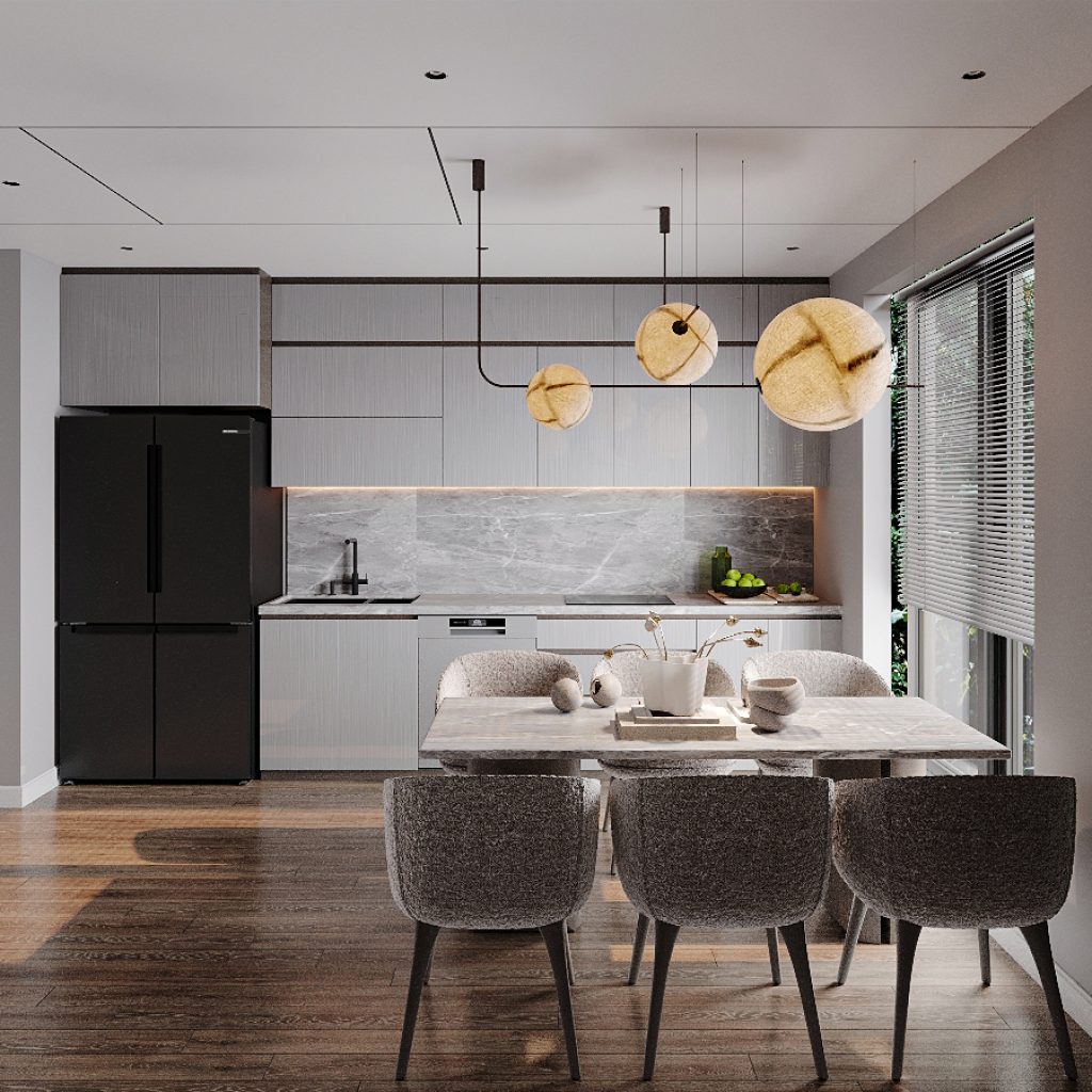 Không gian toát lên sự hiện đại, tối giản nhưng vẫn ấm cúng. Tông màu trung tính chủ đạo: ‘xám, trắng, be’ kết hợp với màu gỗ tự nhiên, tạo nên cảm giác thanh lịch và sang trọng. Vật liệu đá tự nhiên được ứng dụng ở mặt bàn và mảng tường bếp, vừa bền bỉ vừa tạo điểm nhấn nổi bật.