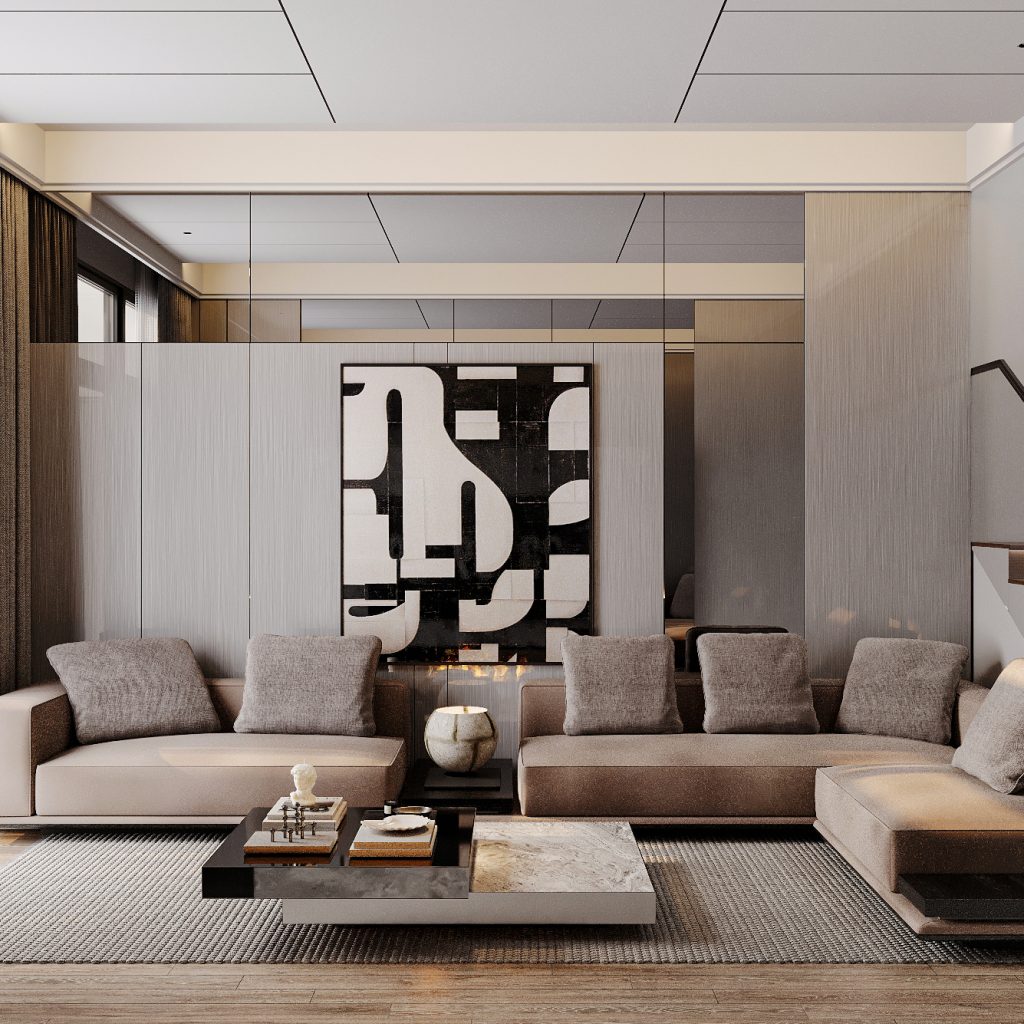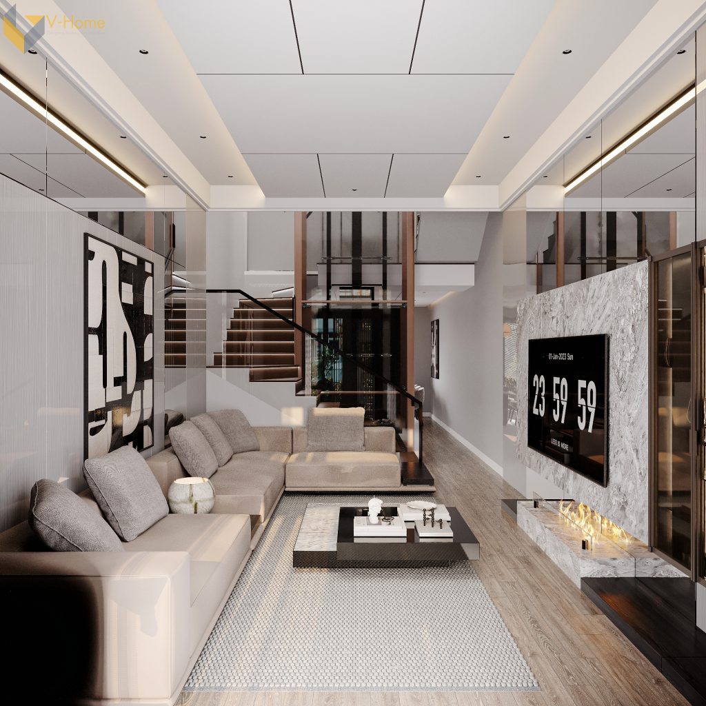 Khi khách hàng bước chân vào căn nhà đã cảm nhận rõ phong cách hiện đại tối giản (Modern Minimalism) mà các kiến trúc sư của V-Home mang tới. Không gian được tạo nên từ các gam màu trung tính như xám, be, nâu nhạt, kết hợp cùng chất liệu kính, gỗ và đá tự nhiên. Đường nét nội thất vuông vắn, mạch lạc, loại bỏ hoàn toàn chi tiết rườm rà để nhấn mạnh sự tinh gọn.
