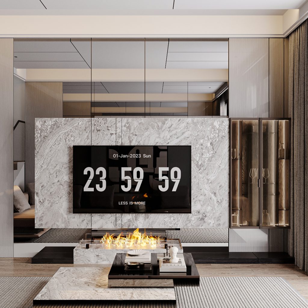 Các mảng tối – sáng đã được V-Home cân bằng tốt, mang lại chiều sâu thị giác (Sang trọng nhưng không phô trương: Kết hợp vật liệu cao cấp đá, gỗ, kính nhưng vẫn tinh giản; Không gian thoáng đãng: Ít chi tiết thừa, tập trung vào công năng)