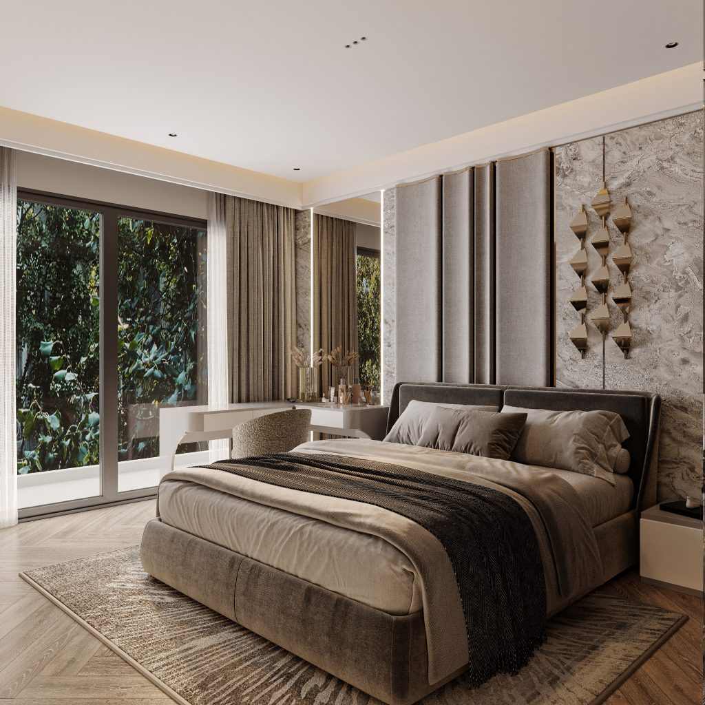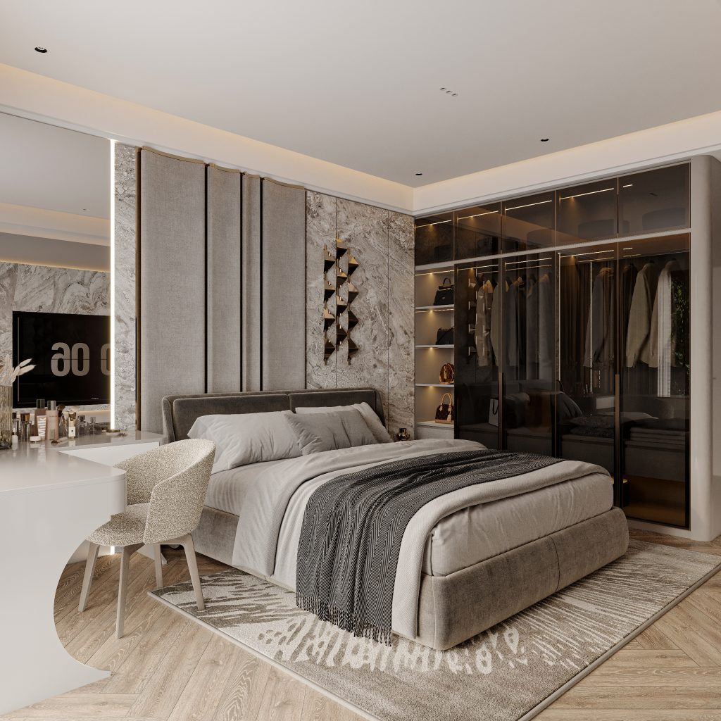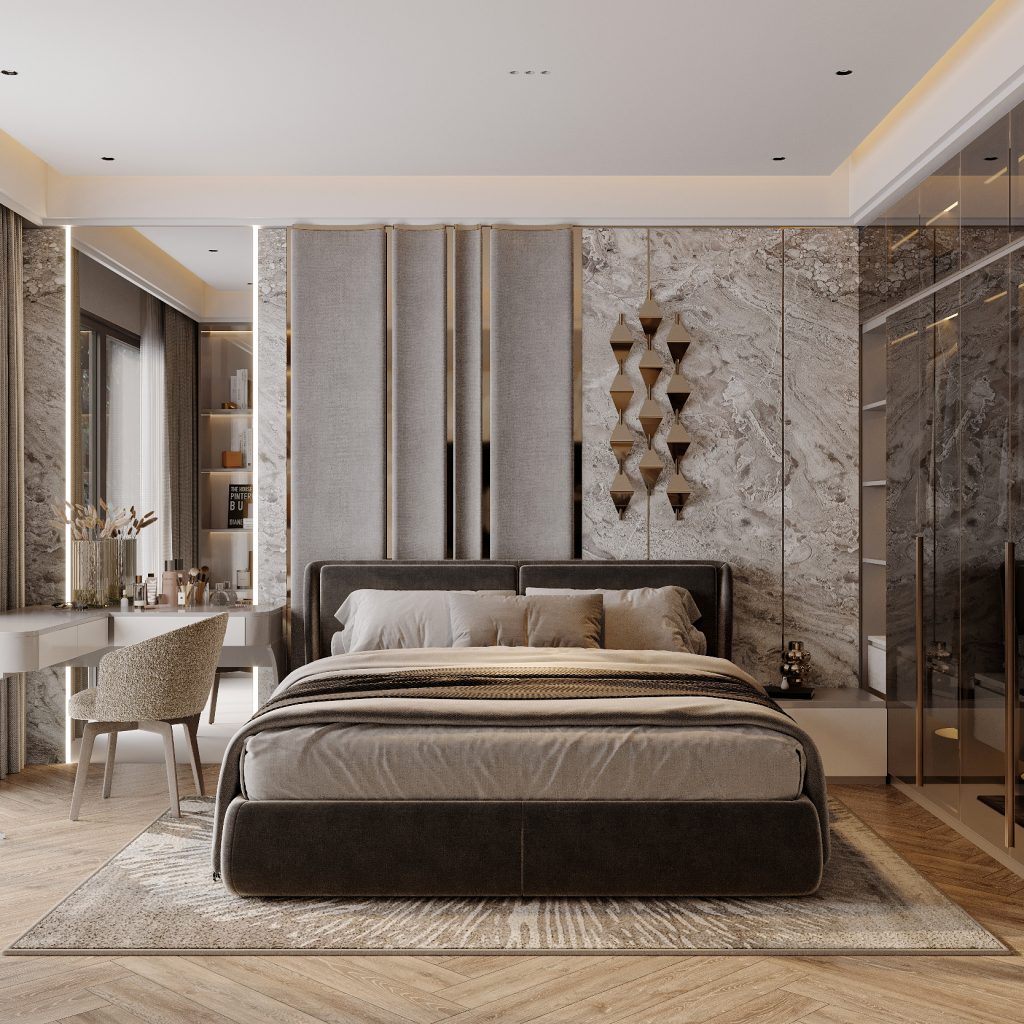 Phòng ngủ master mang đậm phong cách hiện đại sang trọng (Modern Luxury), thể hiện qua việc sử dụng vật liệu cao cấp như đá ốp tường, kính, gỗ và vải nỉ cao cấp. Tông màu trung tính (xám, be, nâu trầm) tạo cảm giác ấm áp, đồng thời nhấn mạnh sự tinh tế và yên tĩnh cần có trong không gian nghỉ ngơi.