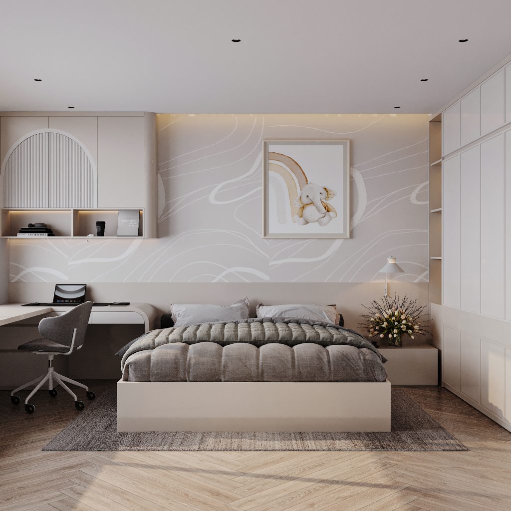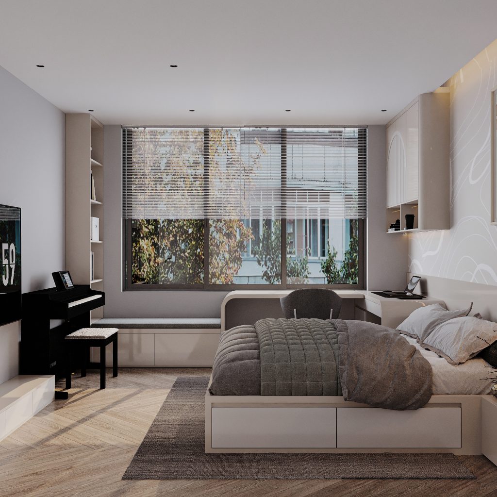 Phòng ngủ phụ mang phong cách hiện đại nhẹ nhàng, với bảng màu sáng gồm trắng – kem – xám nhạt, kết hợp ánh sáng tự nhiên từ cửa kính lớn. Các chi tiết thiết kế đơn giản, mềm mại, phù hợp cho một không gian nghỉ ngơi trẻ trung, dễ chịu.