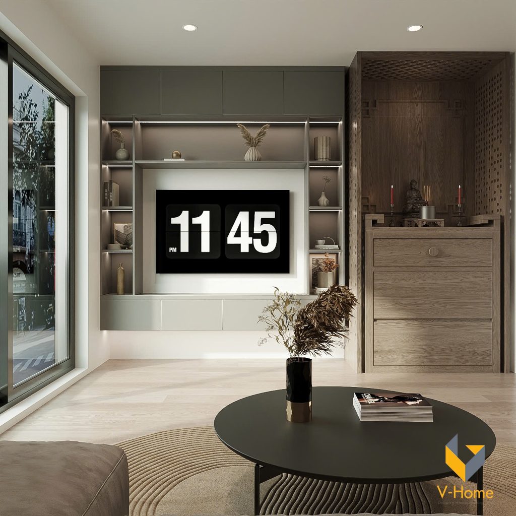 Kệ TV & trang trí: sử dụng những mảng phẳng tinh tế trên tường kết hợp kệ treo gọn gàng, tạo sự hài hòa với phong cách cả căn nhà hướng tới.