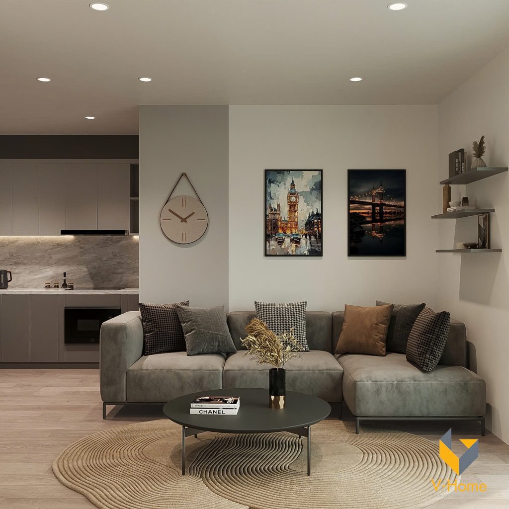 Chúng tôi đã tư vấn cho gia chủ sử dụng sofa bọc nỉ tone xám lông chuột, kết hợp bàn trà tròn đen bóng và thảm trải sàn mang lại sự cân bằng về thị giác. Tường sau sofa được nhấn bằng tranh treo tối giản và mảng tường được sơn hai màu đối lập tạo chiều sâu cho không gian.