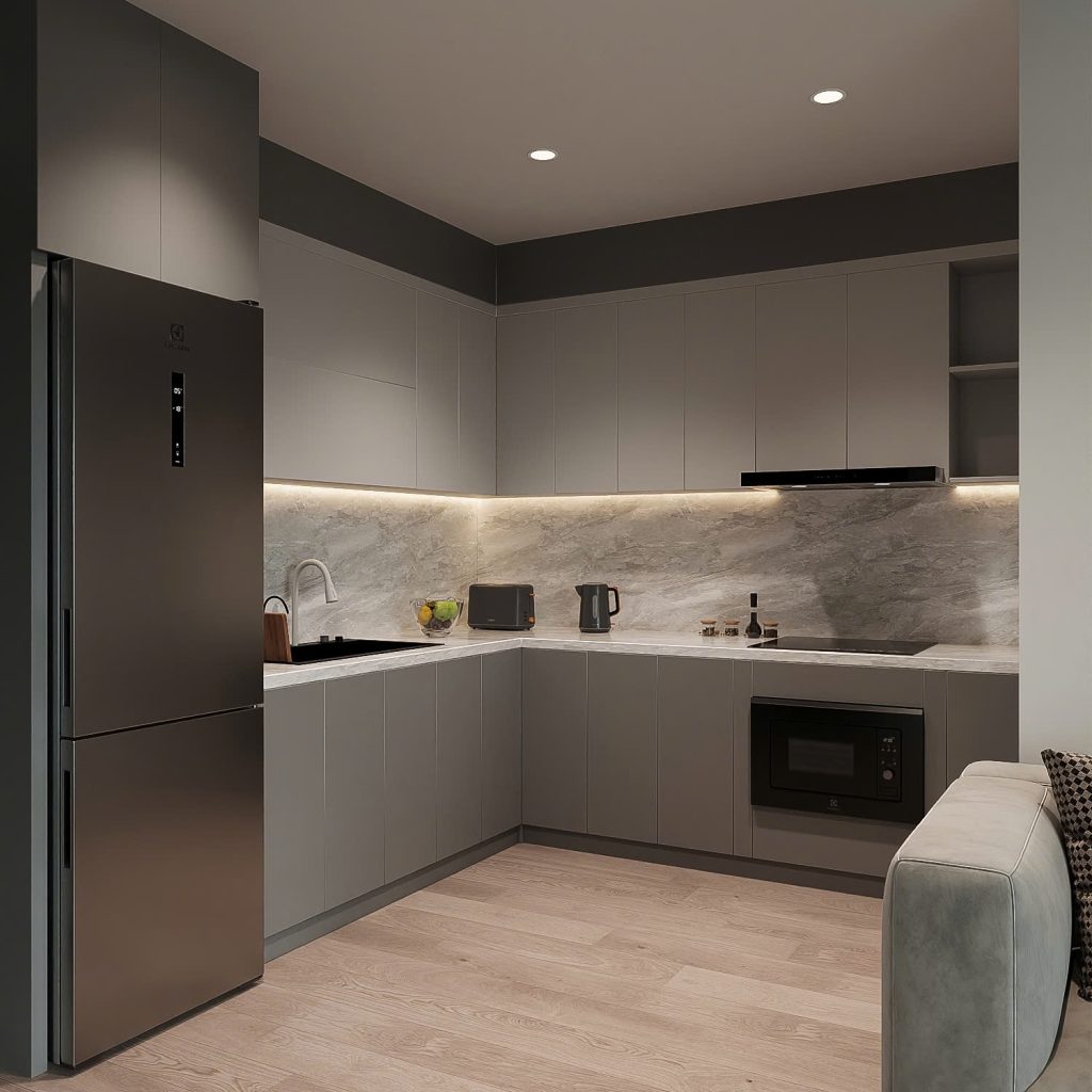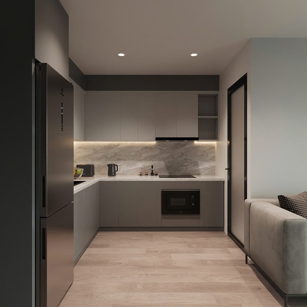 Khu bếp được thiết kế bếp chữ L gọn gàng, tận dụng tối đa diện tích. Ngoài ra, do diện tích quá nhỏ nên chúng tôi đã hướng tới sử dụng loại bàn ăn xếp gọn.