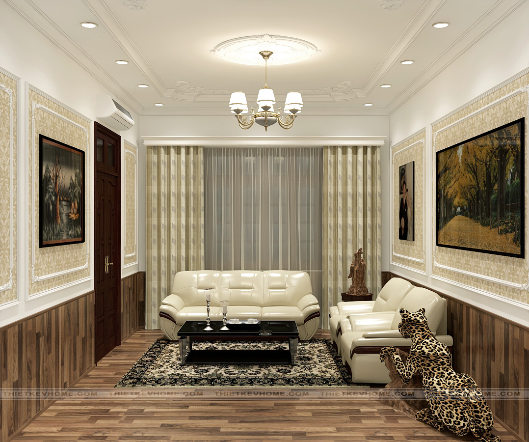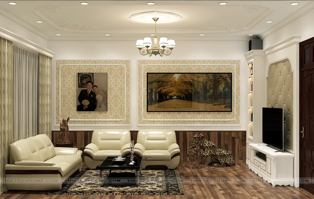 Nội thất tân cổ điển là sự cách tân của phong cách cổ điển, xóa bỏ sự nặng nền rườm rà trong chi tiết thiết kế, mà thay vào đó thổi hơi thở cuộc sống hiện đại và không gian nội thất. Vì vậy thiết kế nội thất phòng khách tân cổ điển có vẻ đẹp trường tồn với thời gian, mang đến sự hài lòng cho gia chủ, sự trầm trồ ngưỡng mộ của khách vị khách tới thăm. Bộ sofa bằng da với thiết kế êm ái, sang trọng bao gồm: 1 sofa dài, 2 ghế sofa đơn và bộ bàn trà. Ngoài ra, thiết kế nội thất là sự hài hòa giữa ý tưởng của gia chủ và sự sáng tạo của kiến trúc sư, nên không gian nội thất luôn mang đậm dấu ấn cá nhân khác biệt của gia chủ. Gia chủ là người có cá tính mạnh mẽ, trưng bày báo đốm thể hiện sự quyền lực.
