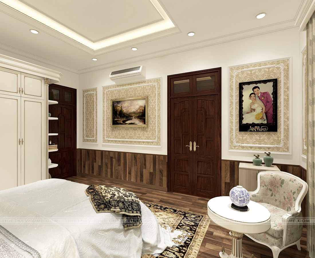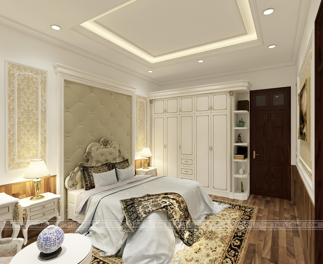 Thiết kế nội thất phòng ngủ master theo phong cách tân cổ điển mang lại vẻ đẹp lung linh, quý phái. Phòng ngủ master luôn được chú trọng trong thiết kế, bởi có được giấc ngủ ngon thì con người mới có sức khỏe để làm mọi việc và có được sức khỏe là có được tất cả. Chiếc giường ngủ êm ái, đẹp đẽ kia ai mà không muốn được sở hữu? Từng chi tiết trong thiết kế được chăm chút, tỉ mỉ, được thi công nội thất bởi bàn tay của những thợ lành nghề. Các chi tiết dát vàng mang lại cho không gian nội thất sự sang trọng hoàng gia và quý tộc.