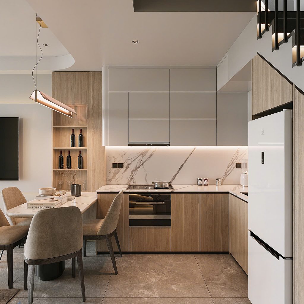 Hệ tủ bếp phẳng, không tay nắm, phủ laminate mờ cùng gam màu trung tính be – xám đem lại cảm giác gọn gàng và hiện đại. Gỗ ốp tự nhiên được sử dụng tinh tế ở kệ trang trí và bàn ăn, tạo sự ấm áp, cân bằng với sắc lạnh của đá và kim loại.