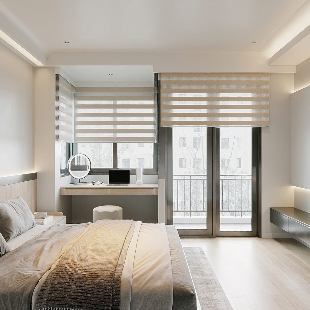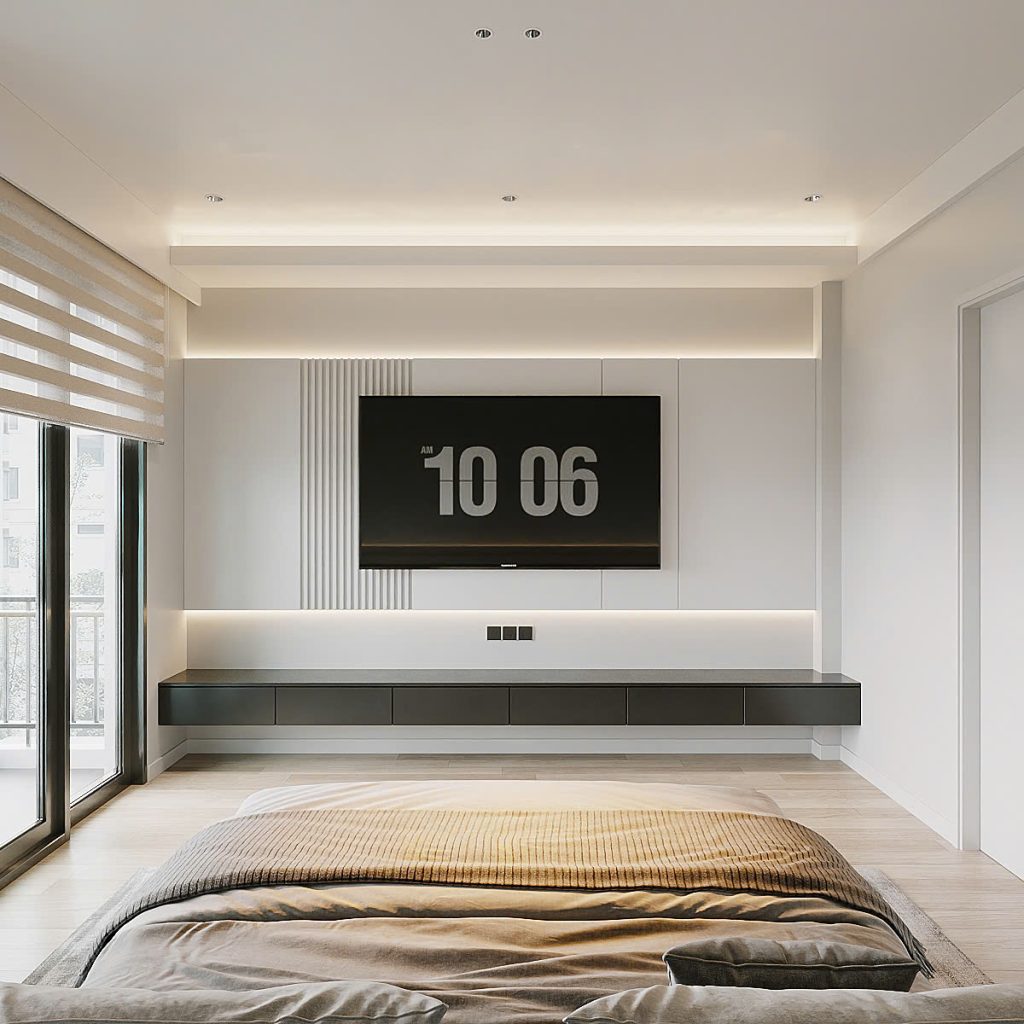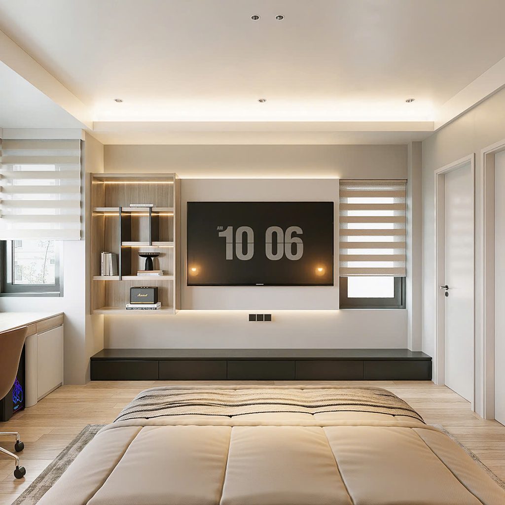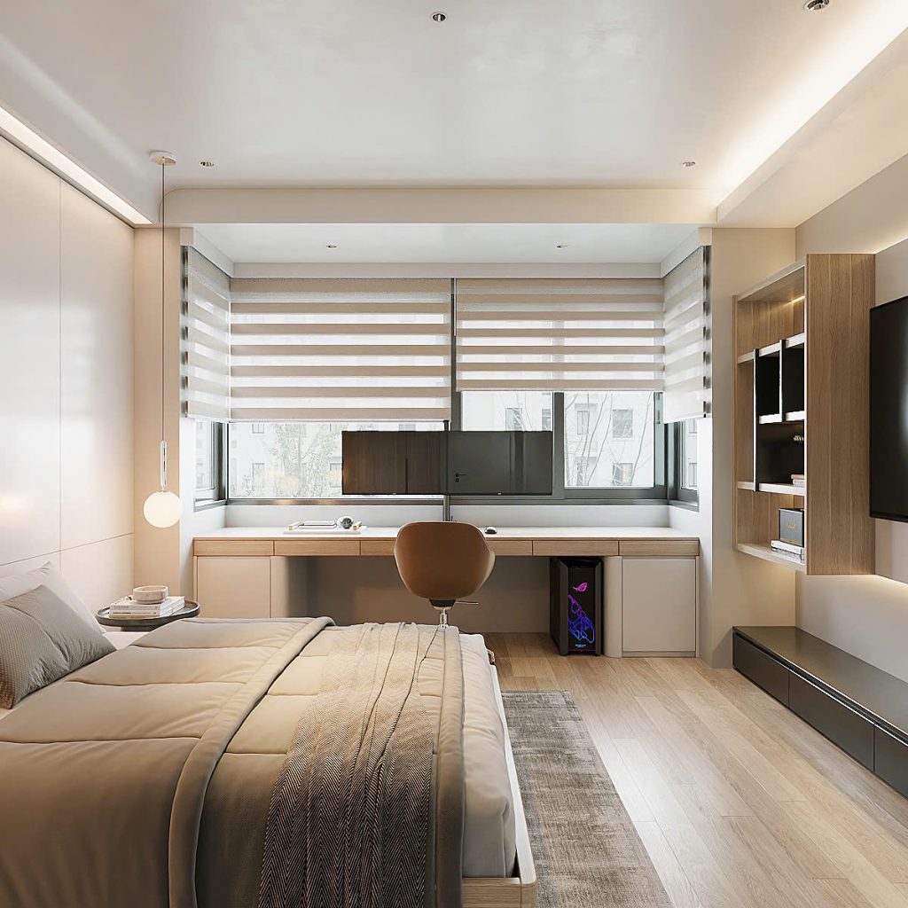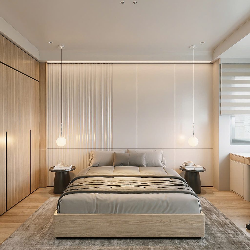 Phòng ngủ được thiết kế theo phong cách hiện đại tối giản (Modern Minimalist), với tông màu chủ đạo là trắng – be – gỗ sáng. Không gian gọn gàng, nhiều ánh sáng tự nhiên, vừa mang lại cảm giác thư giãn, vừa tạo môi trường sống khoa học, tiện nghi.