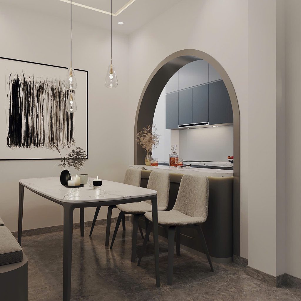 Khi bước vào không gian bếp, chúng ta sẽ thấy được tông màu chủ đạo ở đây là: ‘Xám tro, trắng’ kết hợp với vân đá trắng của bàn ăn,bàn bếp. Sàn gạch xám vân đá đồng bộ với khu phòng khách, giữ sự liền mạch không gian.