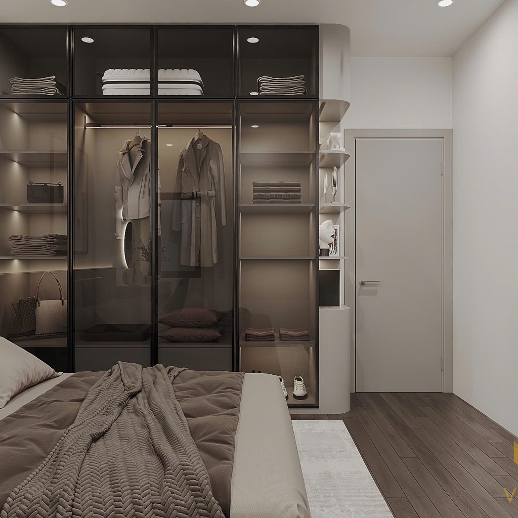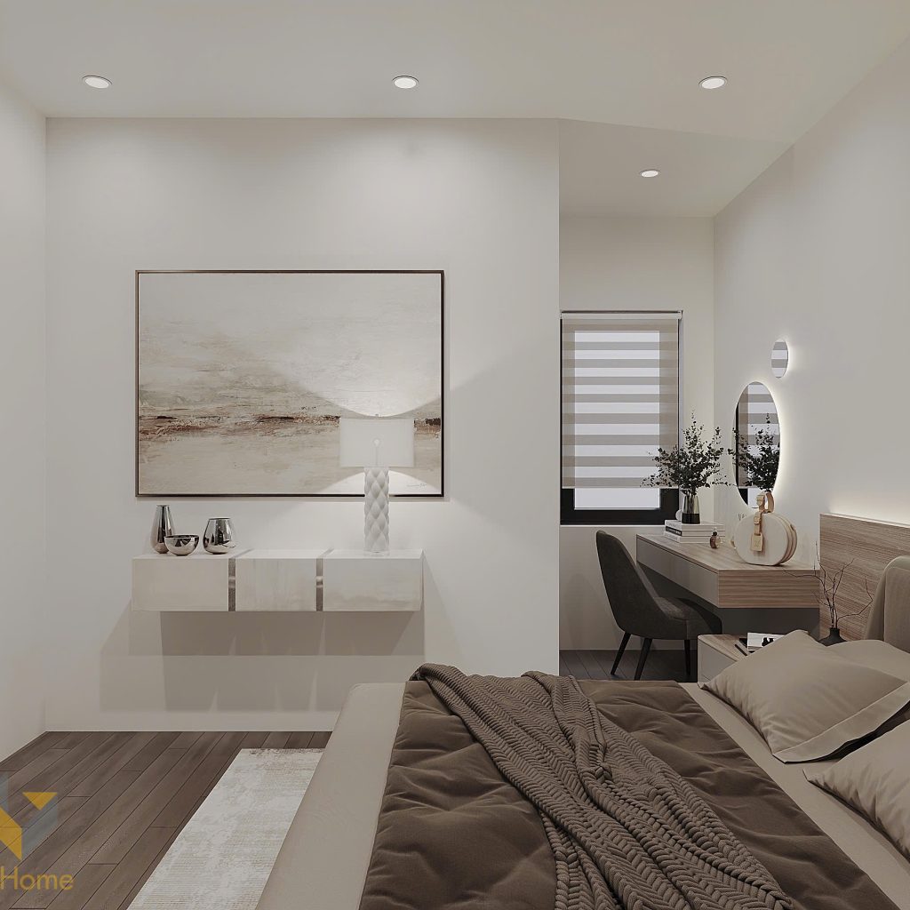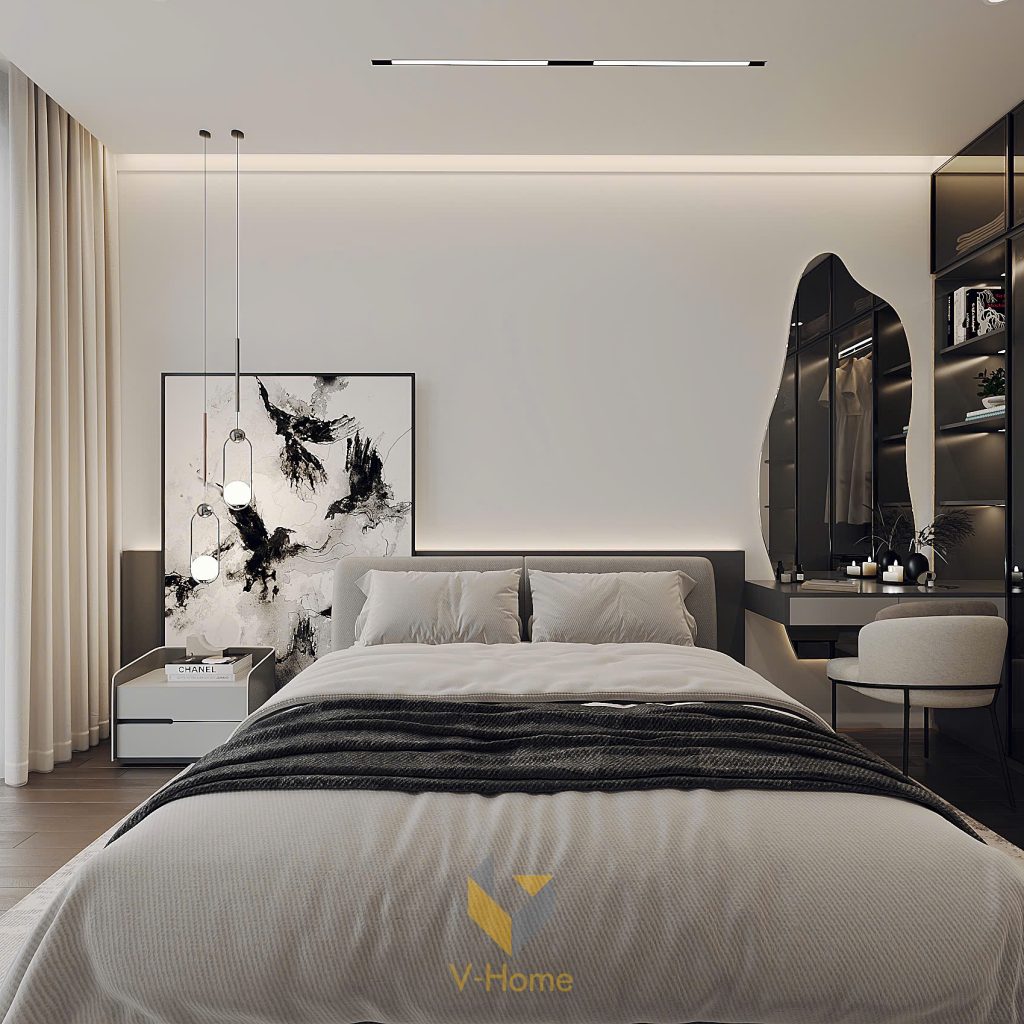 Khi bước chân vào căn phòng này chúng ta đã thấy được việc các kiến trúc sư của V-Home mang đến hơi thở phong cách hiện đại tinh giản với các đường nét gọn gàng và bảng màu trung tính. Sự kết hợp giữa chất liệu cao cấp, ánh sáng tinh tế và cách sắp xếp hợp lý đã tạo nên một không gian vừa sang trọng lại vừa gần gũi, phù hợp với nhịp sống đô thị.