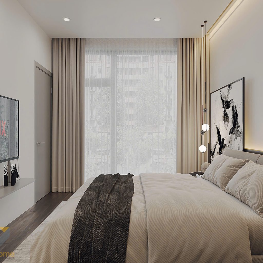 Bố trí khoa học: Giường ngủ đặt trung tâm, bên cạnh là tủ quần áo và bàn trang điểm nhỏ gọn cùng với kệ tab trang trí bằng bức trang lớn. đối diện kệ TV âm tường,