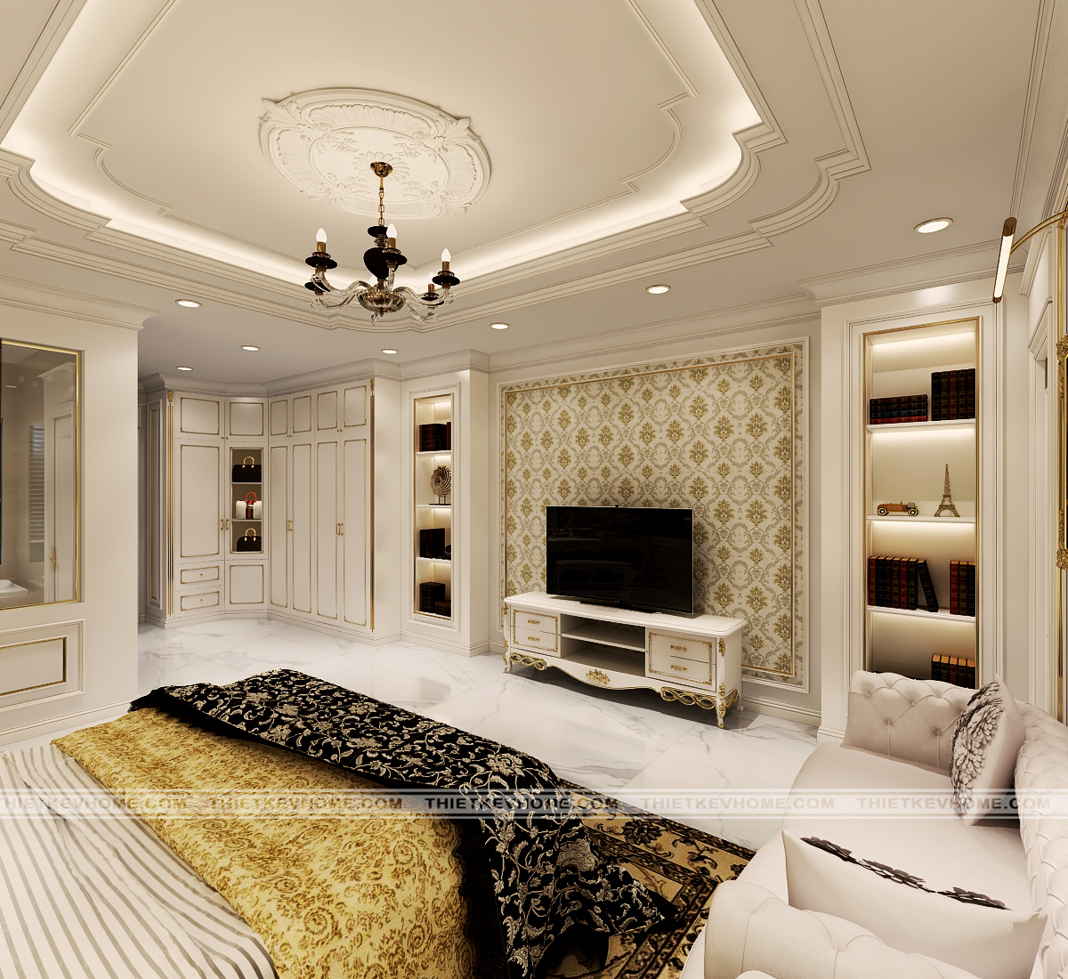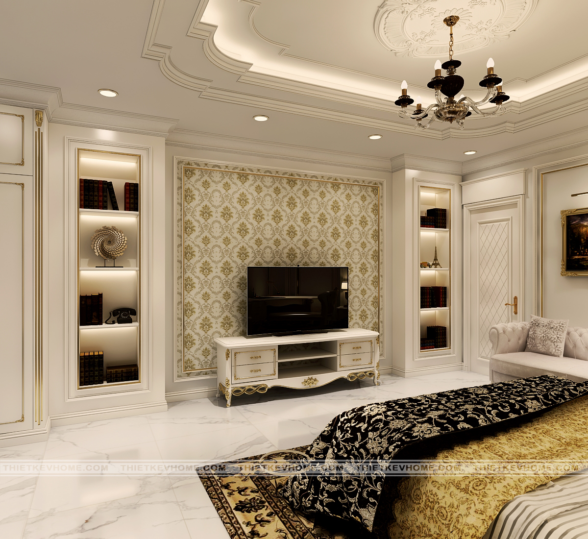 Bao trùm không gian nội thất tân cổ điển là màu trắng sang trọng, đẳng cấp, mang lại sự sáng cho căn phòng. Chính trên nền màu trắng ấy, các đường nét phào chỉ mạ vàng đã trở thành điểm nhấn, nét chấm phá cho căn phòng của chủ nhân ngôi nhà. Chi tiết mạ vàng giúp khẳng định đẳng cấp hoàng gia, sự giàu có của gia chủ. Thiết kế kệ ti vi đối diện giường ngủ, tủ kệ trang trí đối xứng hai bên tạo nên một không gian cân xứng, hài hòa. Giấy dán tường sau ti vi cũng mạ họa tiết màu vàng ton sur ton với nội thất phòng ngủ. Thiết kế nội thất mang đến cho gia chủ một không gian nghỉ ngơi, thư giãn như đẳng cấp của một khách sạn 5 sao