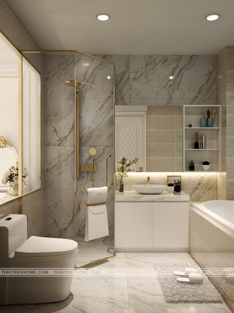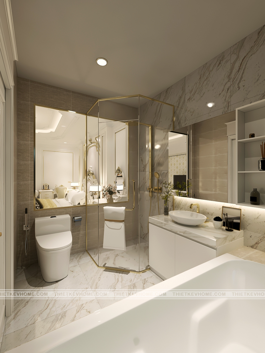 Phòng tắm được thiết kế khá là thông minh khi sử dụng vách tắm kính 135 độ để ngăn không gian. Với mẫu vách kính này sẽ giúp cho gia chủ có được không gian xả stress thoải mái, hiện đại mà không sợ nước trà khắp căn phòng.