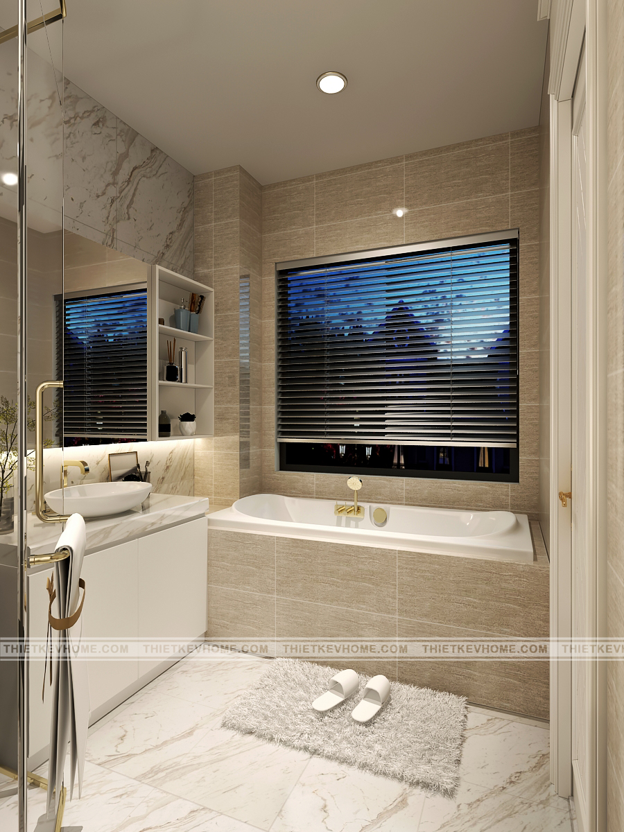 Phòng tắm phòng ngủ master có diện tích khá rộng. Kiến trúc sư thiết kế bồn tắm nằm giúp gia chủ có thể thực sự thư giãn sau một ngày làm việc mệt mỏi, trút bỏ mọi muộn phiền.
