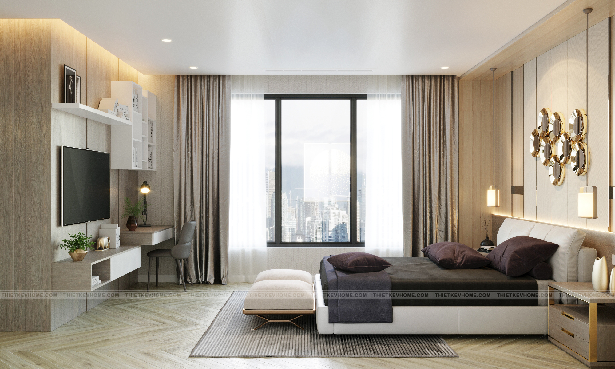 Giường ngủ ở vị trí trung tâm của không gian nội thất được bọc da êm ái, sang trọng. Ốp sau giường sử dụng vách ốp gỗ trang trí tạo điểm nhấn cùng decor treo tường mang lại sự ấn tượng cho không gian riêng tư của gia chủ. Với thiết kế đối xứng hai bên mang lại vẻ đẹp cân đối hài hòa cho nội thất phòng ngủ master. Đèn thả phòng ngủ góp phần tăng lên vẻ đẹp và giá trị của nội thất cao cấp. Đối diện giường ngủ kệ ti vi treo tường và bàn làm việc. Tông màu gỗ mới lạ, độc đáo mang lại sự thích thụ, hứng khởi cho không gian sống.