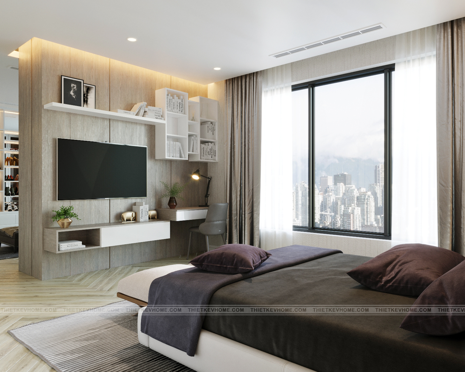 Thiết kế nội thất phòng ngủ master Thạch Thất thể hiện cá tính riêng biệt của chủ nhân, sự mới mẻ, năng động tập trung vào công năng của các đồ nội thất. Không gian phòng ngủ rộng rãi, sang trọng, đẳng cấp là niềm khao khát của bao nhiêu khách hàng.