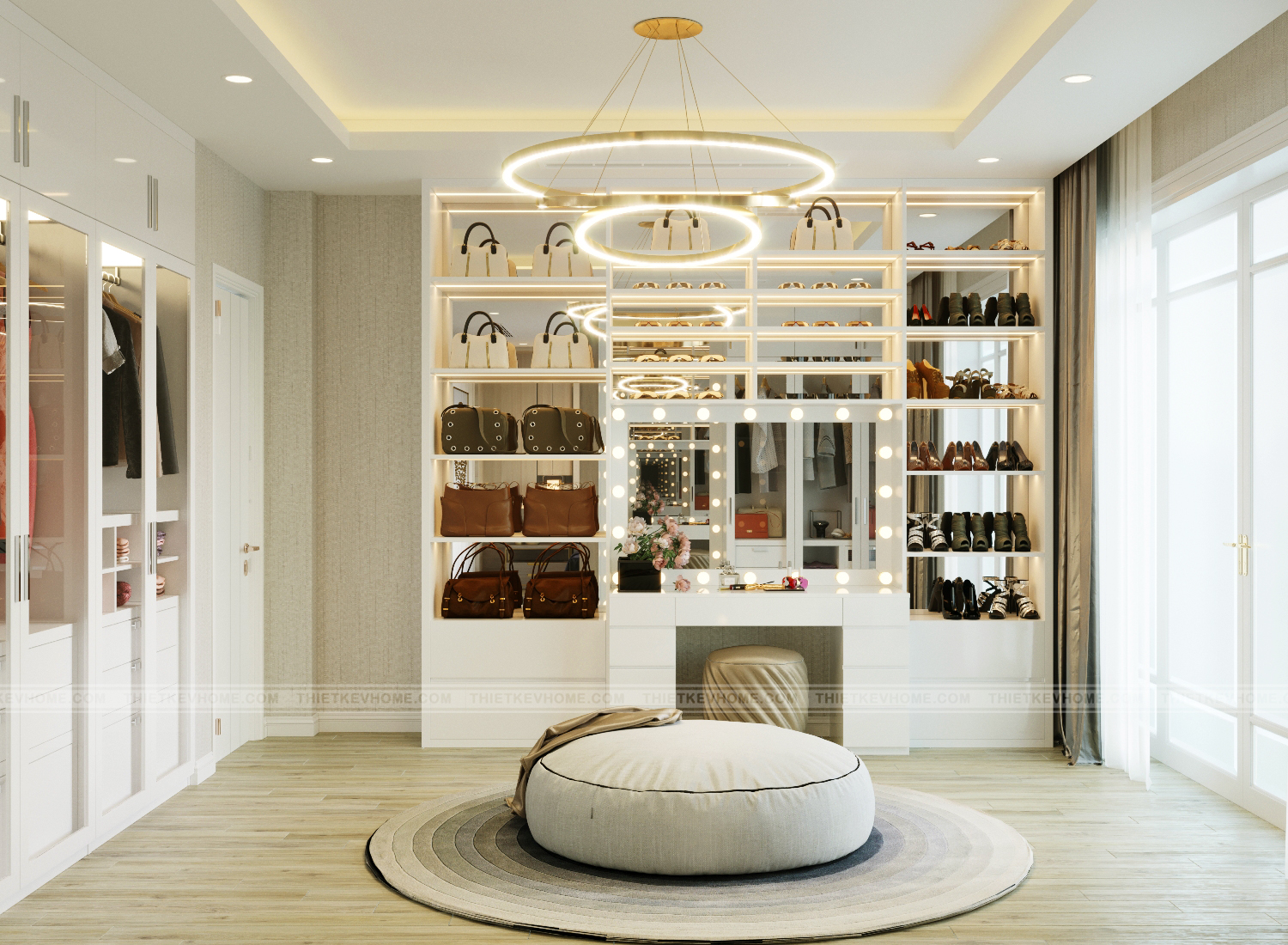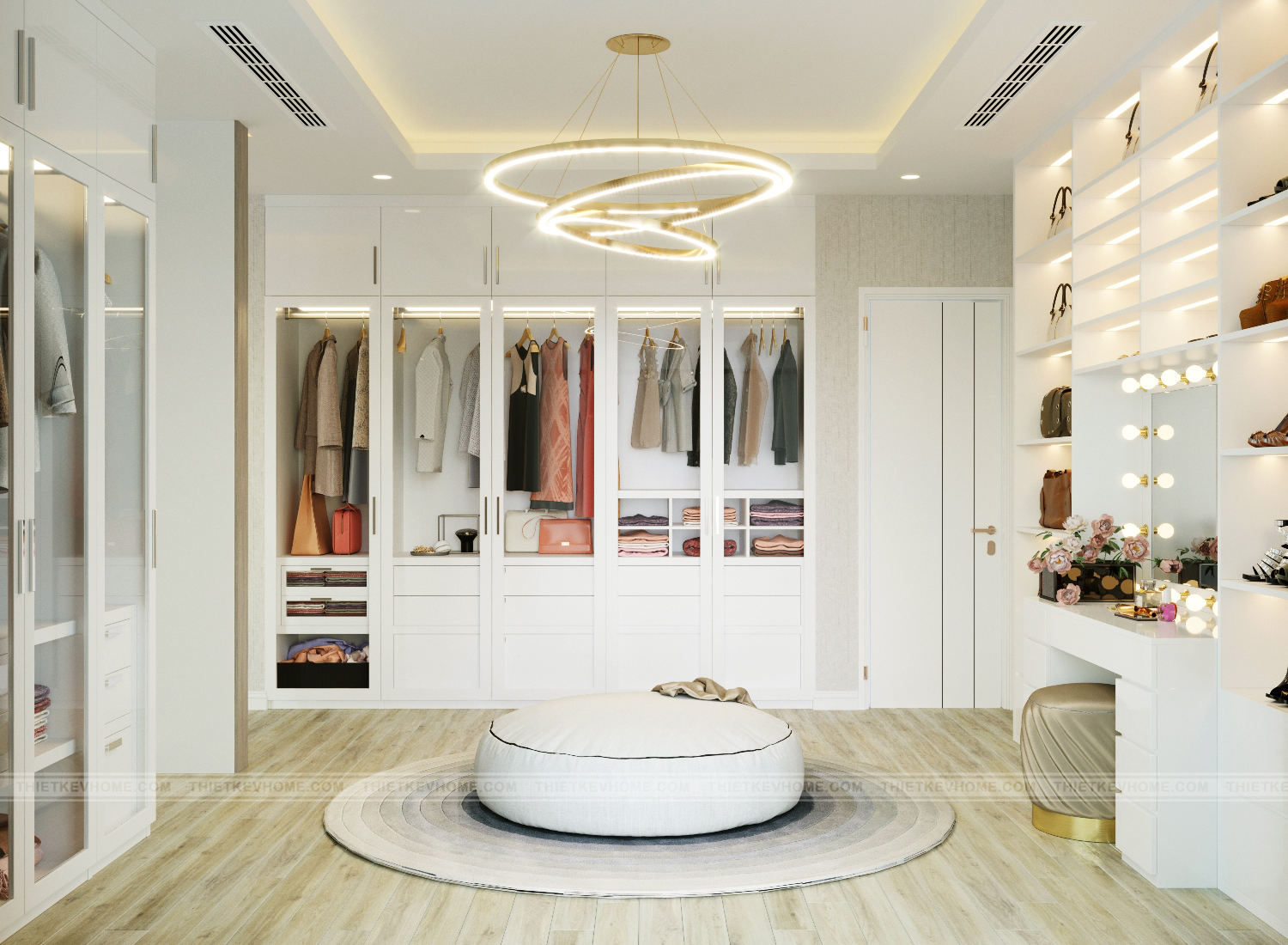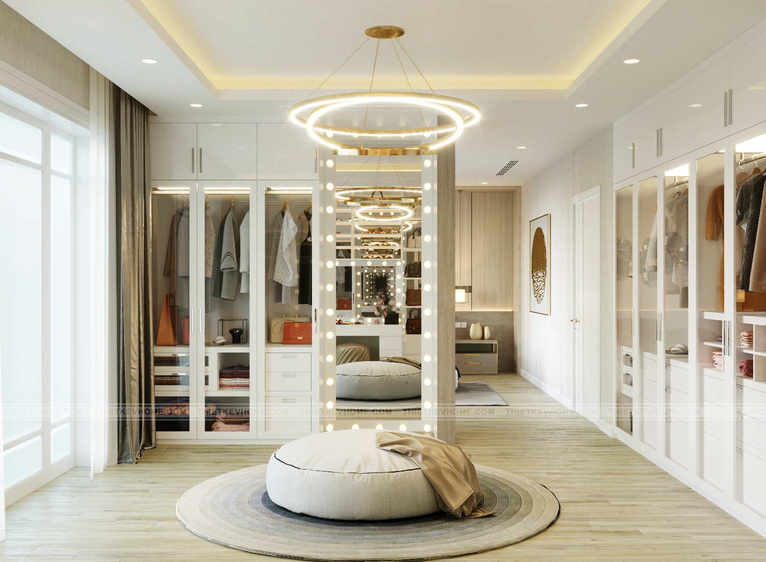 Thiết kế nội thất phòng thay đồ là mong ước muốn sở hữu của bao nữ chủa nhân. Phòng thay đồ rộng rãi với hệ thống tủ sang trọng đẳng cấp. Màu trắng vừa mang lại sự tinh tế, vừa cho thấy vẻ đẹp lỗng lẫy cùng hệ thống đèn led chiếu sáng mang lại vẻ đẹp lung linh, huyền ảo cho nội thất cao cấp.