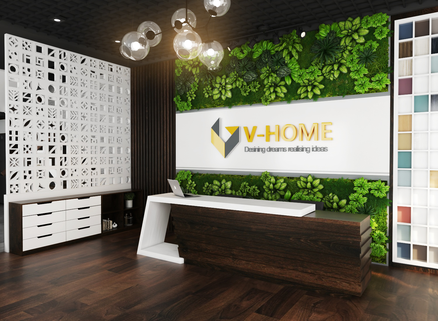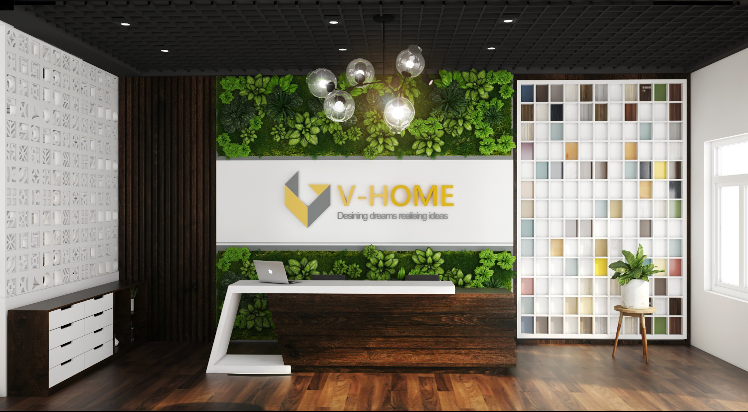 Thiết kế nội thất văn phòng V-Home Sài Gòn bao gồm 2 khu vực: Khu vực bên ngoài là khu vực tiếp khách gồm bộ sofa, bàn lễ tân, và phía bên trong là phòng làm việc của các kiến trúc sư. Thiết kế nội thất văn phòng V-Home Sài Gòn tuy đơn giản nhưng mang lại một cảm giác tinh tế, hướng sáng. Nổi bật lên là thương hiệu V-Home và slogan “Design dreams realising ideas”, thiết kế V-Home góp phần mang lại một không gian sống hoàn hảo cho các vị khách hàng. Thiết kế nội thất văn phòng V-Home sử dụng trần nhôm mang lại sự cách điệu, điểm nhấn cho không gian. Vách trang trí bằng cây xanh và vách ngăn bằng gạch thông gió vừa mang lại vẻ đẹp cho không gian văn phòng, vừa mang lại sự thông thoáng và mát mẻ. Bên cạnh văn phòng là trưng bày các mẫu vật liệu để các kiến trúc sư tư vấn cho khách hàng chọn vật liệu phù hợp với mức đầu tư của mình.