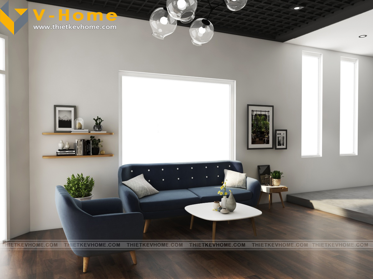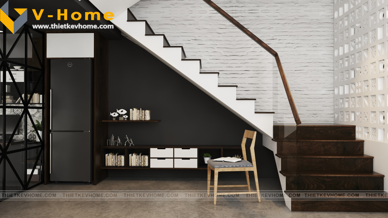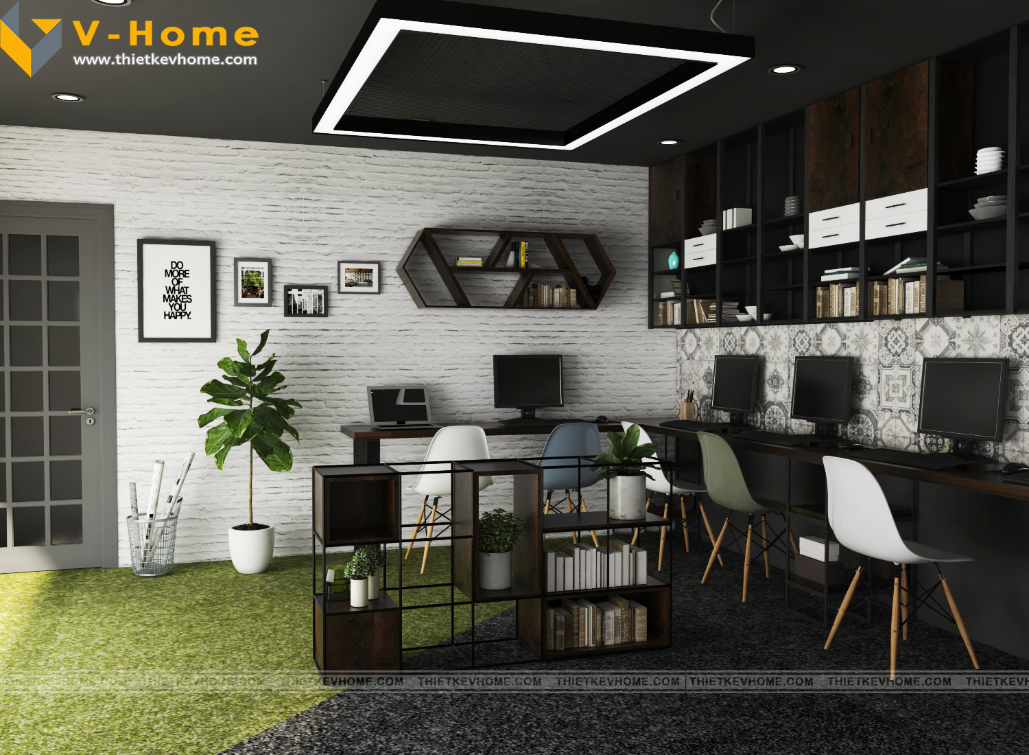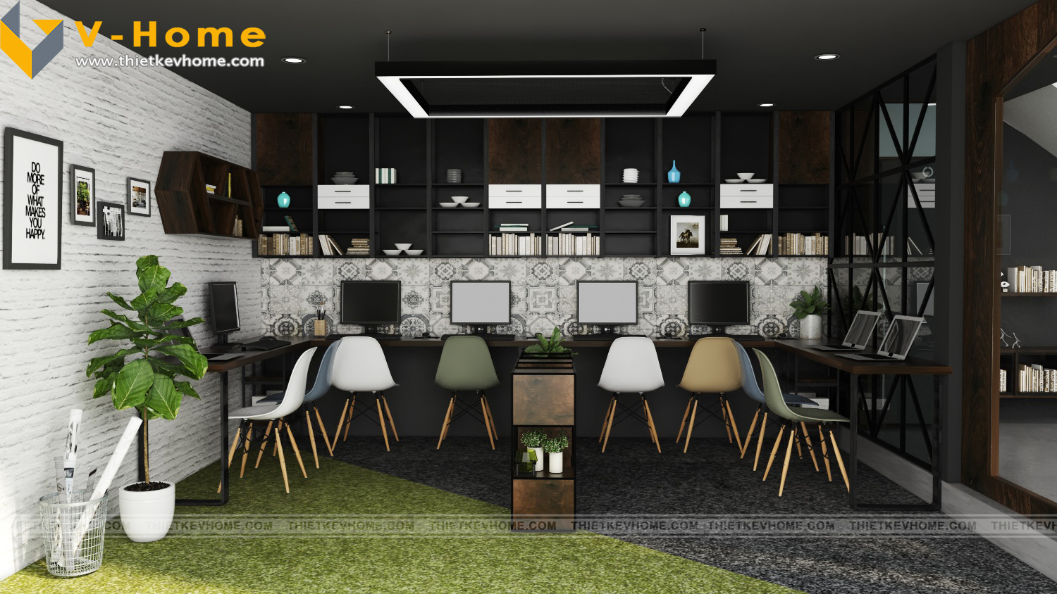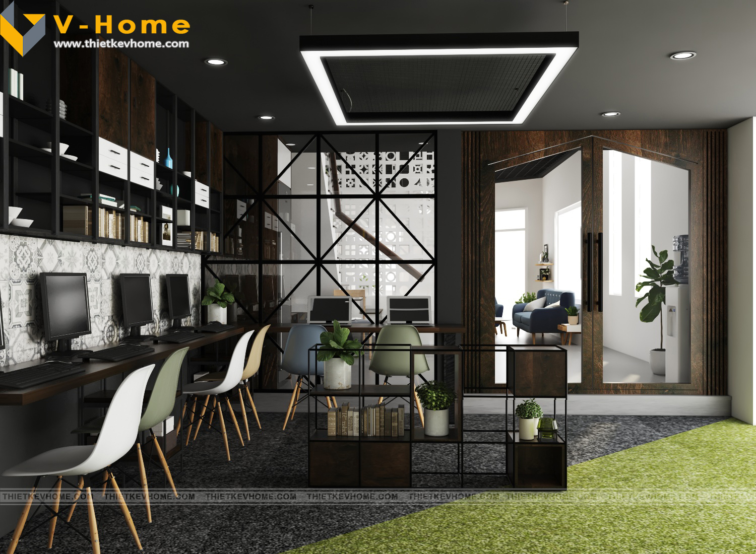 Với diện tích hạn chế, phòng làm việc được thiết kế theo hình chữ U, các đường nét thiết kế đơn giản nhưng cá tính, đậm chất V-Home. Thiết kế nội thất văn phòng vừa mang lại ấn tượng cho khách hàng, thu hút nhiều đối tượng khách hàng, tin vào khả năng của các kiến trúc sư, tin tưởng đơn vị thiết kế mình đã lựa chọn. Thiết kế nội thất còn mang lại cảm hứng sáng tạo các kiến trúc sư khi triển khai ý tưởng, vừa đẹp, vừa mới lạ, vừa độc đáo, không lẫn lộn pha tạp với các không gian nội thất khác, mang lại cho khách hàng sự hài lòng tuyệt đối.