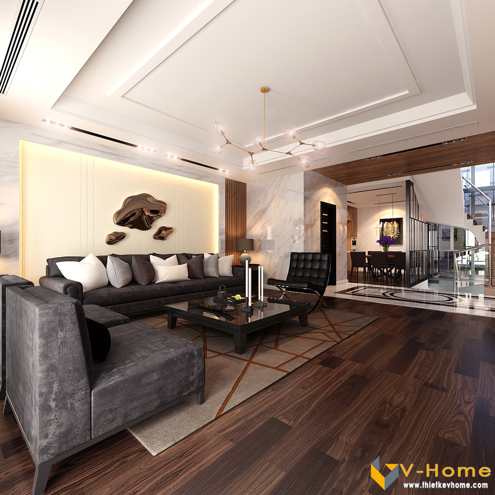 Thiết kế nội thất phòng khách shophouse ấn tượng với hai gam màu xám đen và trắng,tối và sáng tạo sự tương phản rõ rệt. Phòng khách không chỉ là nơi tiếp khách mà chủ yếu là nơi diễn ra sinh hoạt chung của gia đình. Để thiết kế một phòng khách đẹp, các kiến trúc sư đã chăm chút tỉ mỉ từng chi tiết: Đặt bộ sofa ở đâu? Bố trí kệ ti vi ở chỗ nào? Nên sử dụng bàn trà màu gì… Tất cả tạo nên một phòng khách sang trọng và lịch lãm, nơi gắn kết các thành viên trong gia đình.