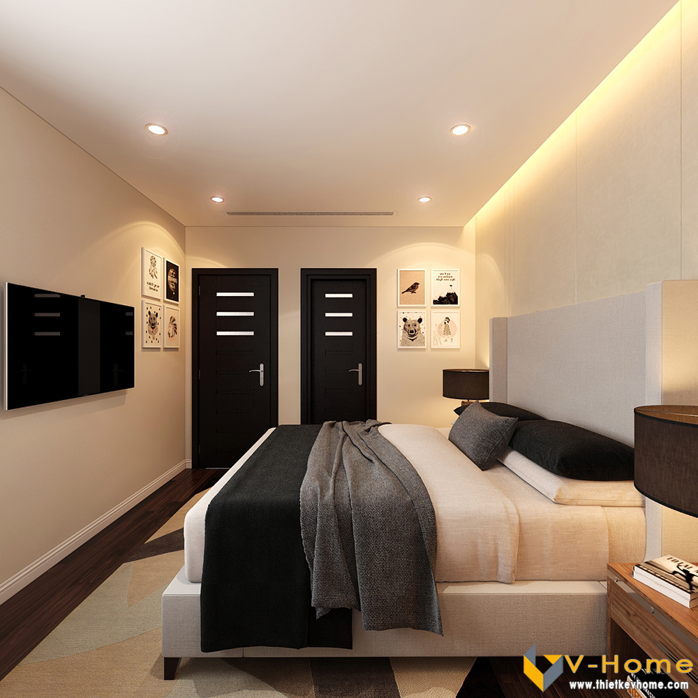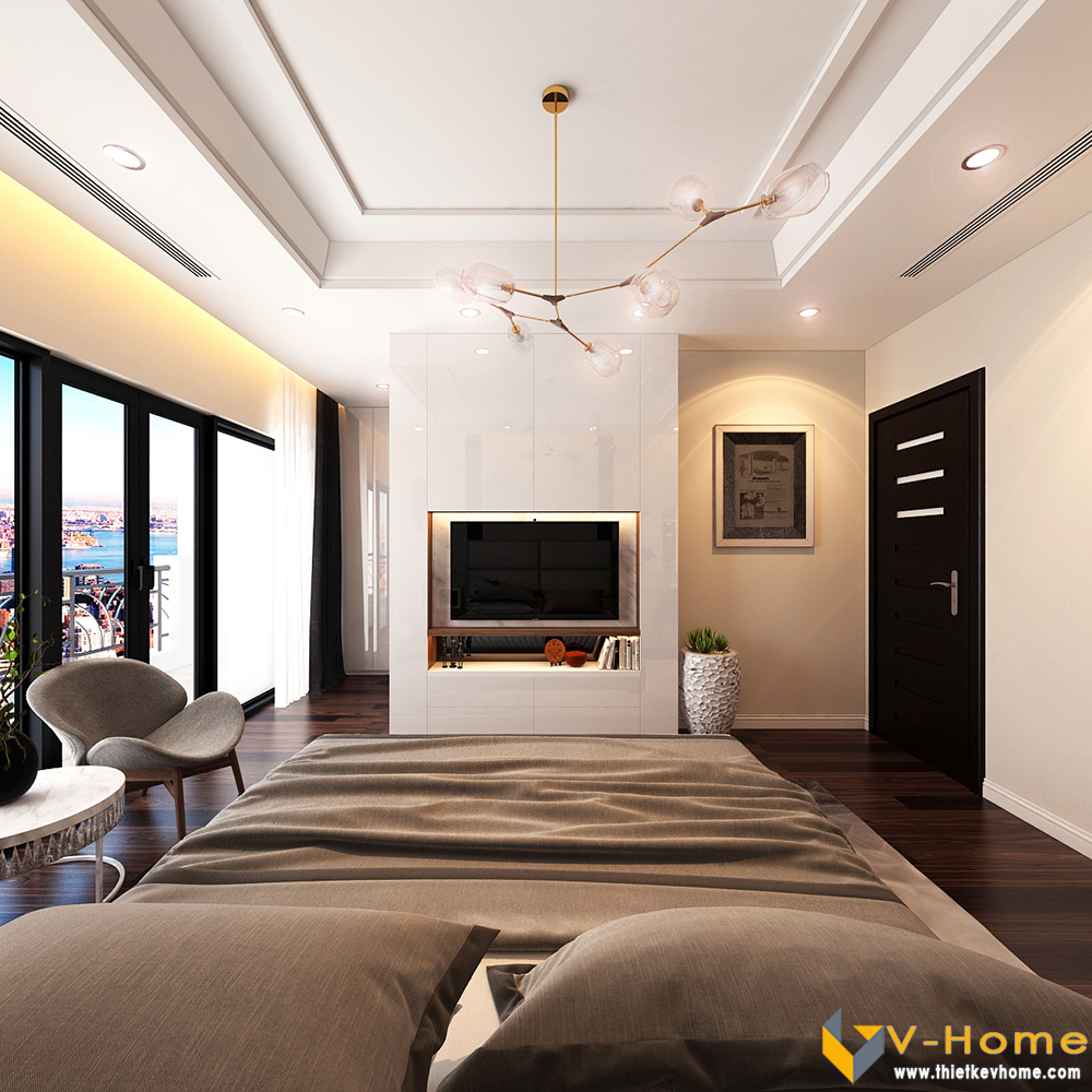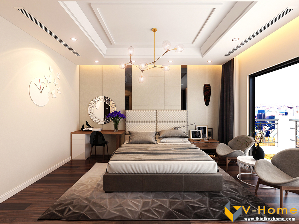 Thiết kế nội thất phòng ngủ master rộng rãi, sang chảnh như đang lạc vào một khách sạn cao cấp. Không gian phòng ngủ còn bố trí một bộ bàn ghế nhỏ, để các thành viên cùng trò chuyện trước khi chìm vào giấc ngủ, hay cùng ngắm cảnh phố phường tấp nập, hít hà chút gió nơi phồn hoa đô thị.