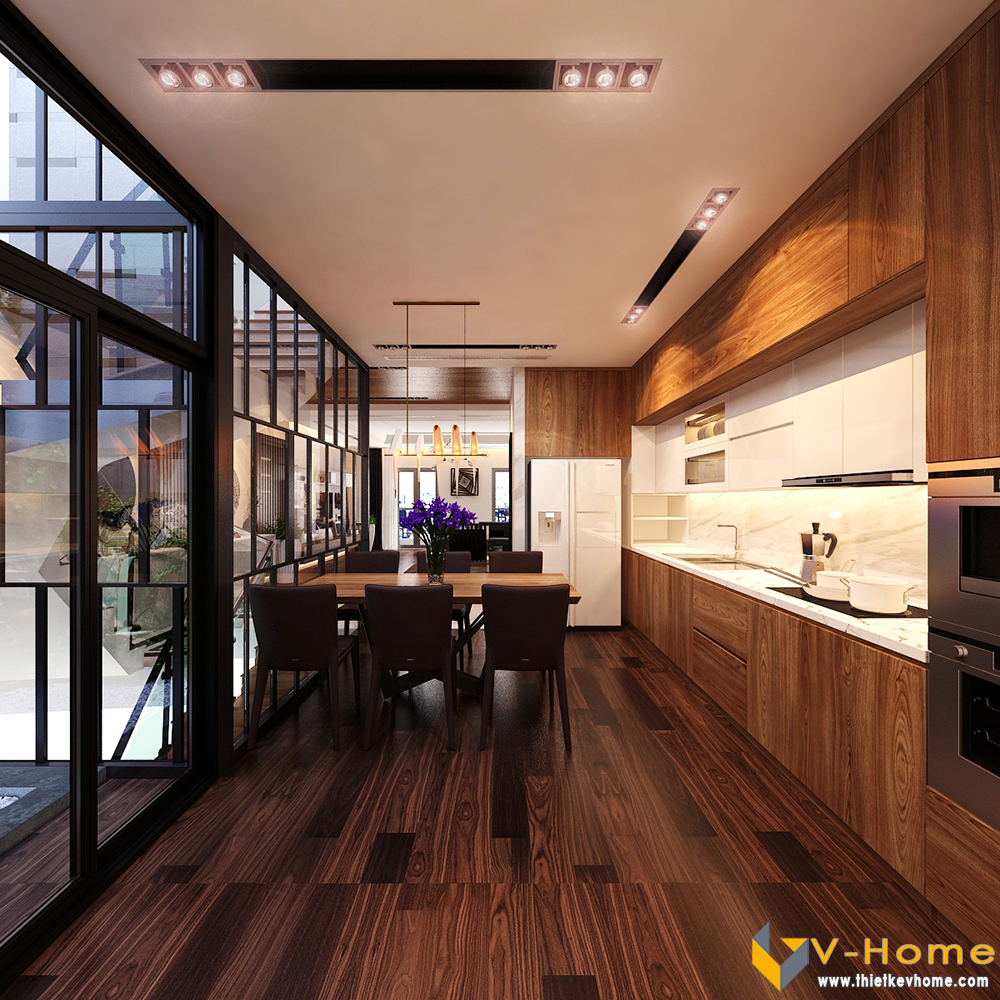 Thiết kế nội thất phòng bếp shophouse kín đáo tách biệt phòng khách. Sự đơn giản, nhẹ nhàng trong thiết kế cùng với màu sắc và vân gỗ điển hình dù không phụ kiện cầu kì vẫn toát lên vẻ lịch lãm, mộc mạc, ấm cúng. Thiết kế nội thất shophouse sử dụng hệ thống khung cửa kính lớn, cơi nới không gian, đảm bảo sự thông thoáng cho phòng bếp và phòng ăn liền kề.