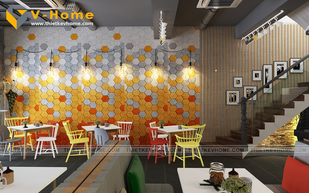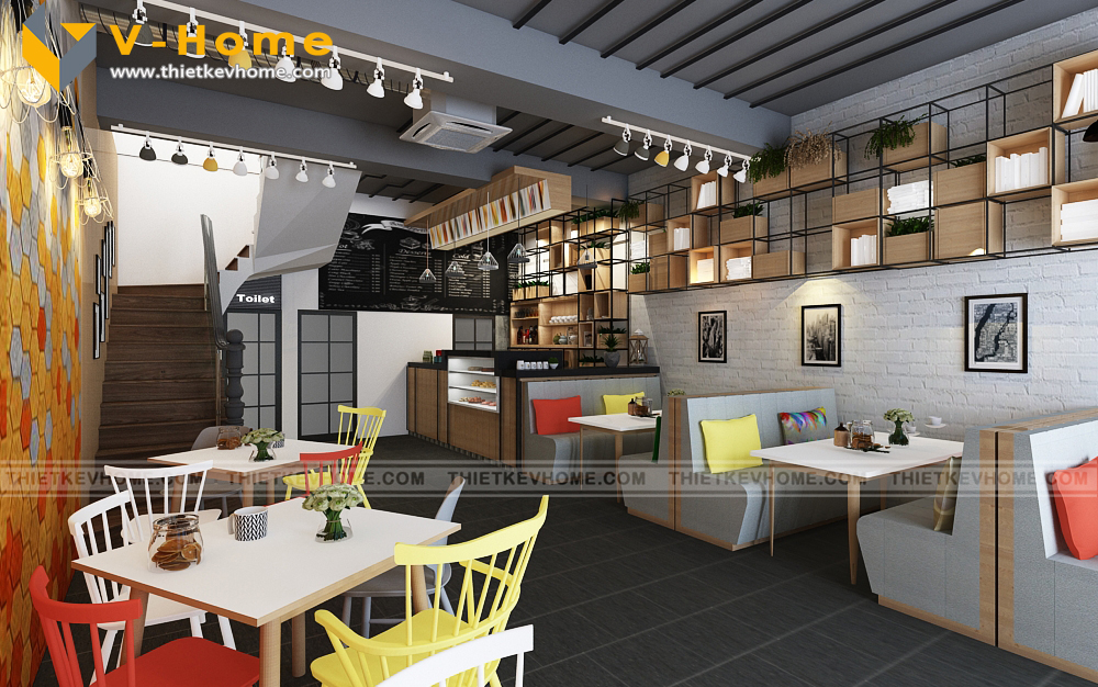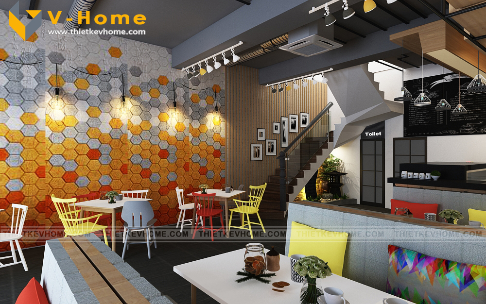 Quán cà phê nhắm tới khách hàng mục tiêu là giới trẻ hiện đại, nên bên cạnh thiết kế sử dụng tone màu xám, nội thất được trang trí, nhấn nhá bởi màu sắc mạnh như đỏ, vàng, cam… mang lại cái nhìn rất riêng, nổi bật phong cách của quán.