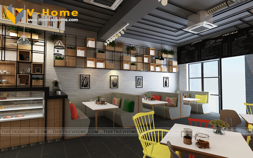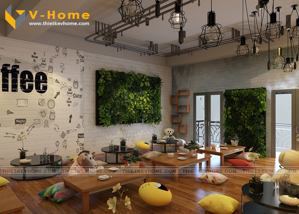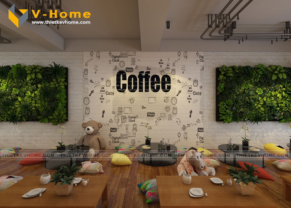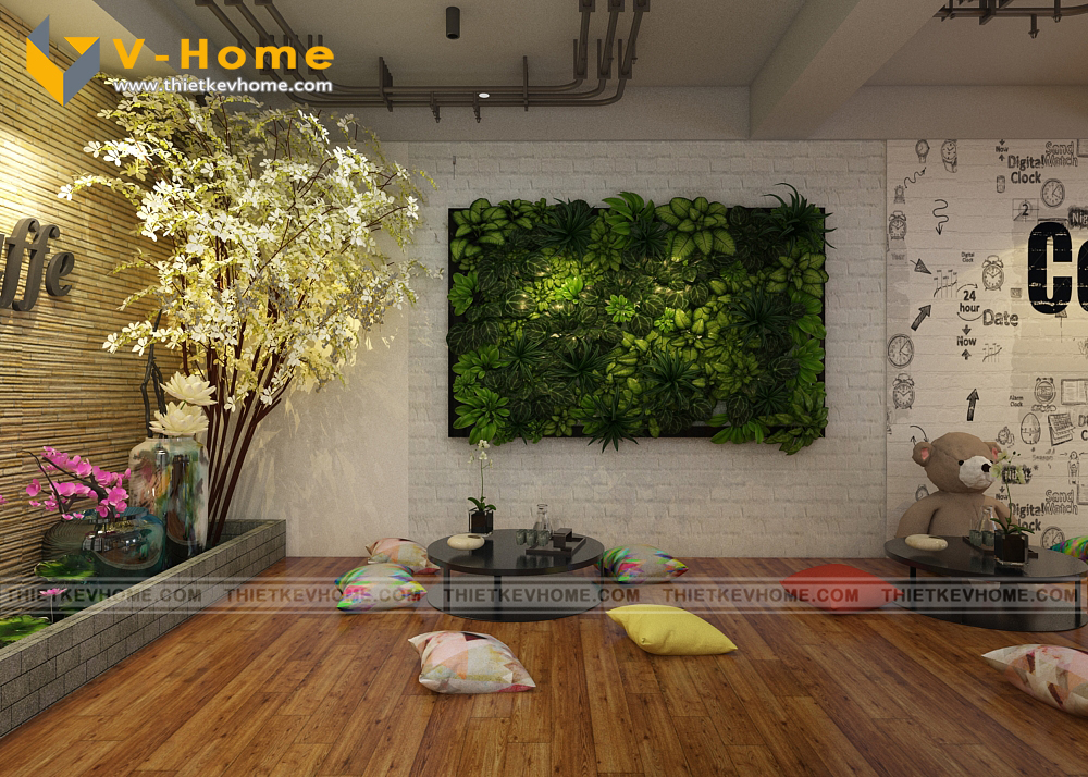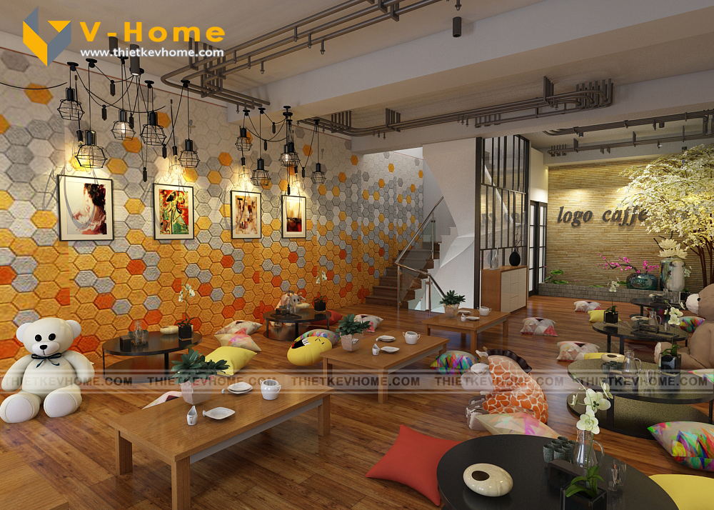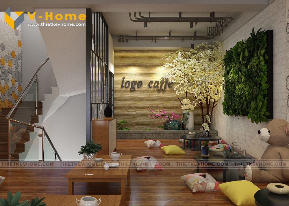 VHome thiết kế cửa hàng cà phê với hai không gian tách biệt: Không gian tầng một để ngồi ghế lịch sự, êm ái, còn không gian tầng hai để ngồi bệt giành cho những khách hàng ưa thích sự thoải mái và yên tĩnh.