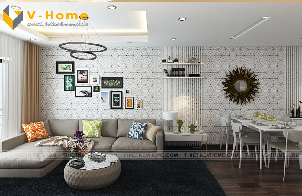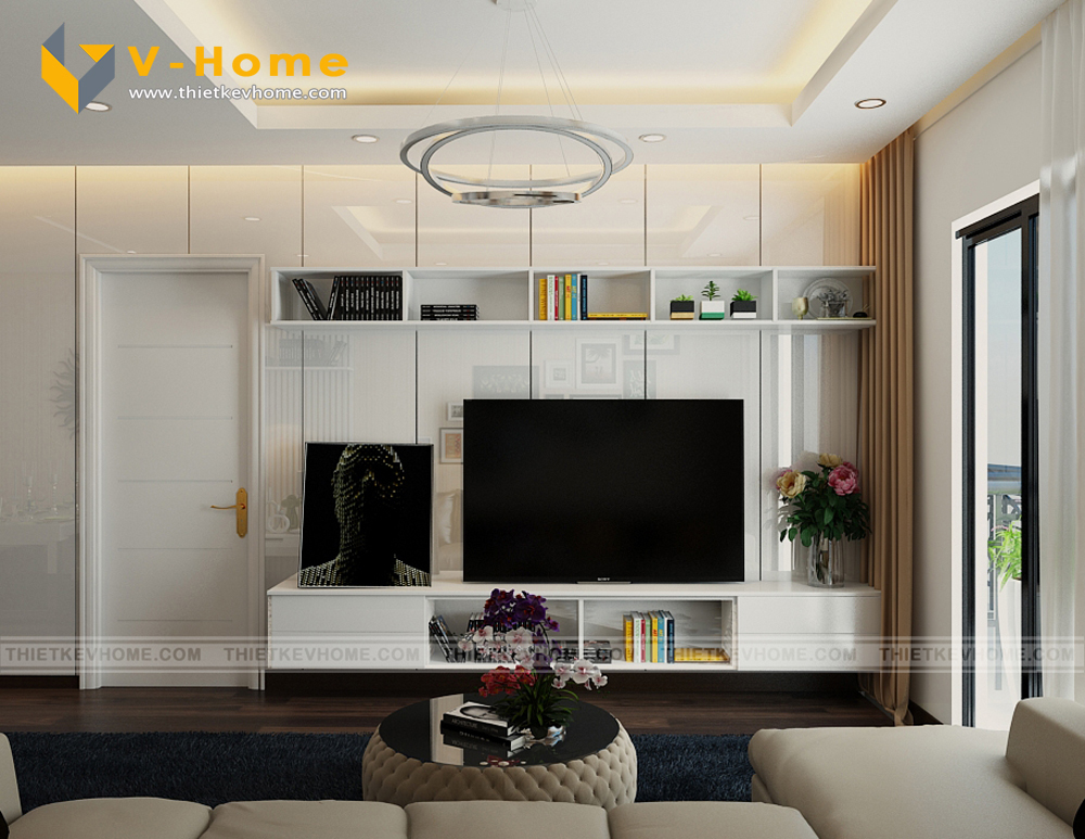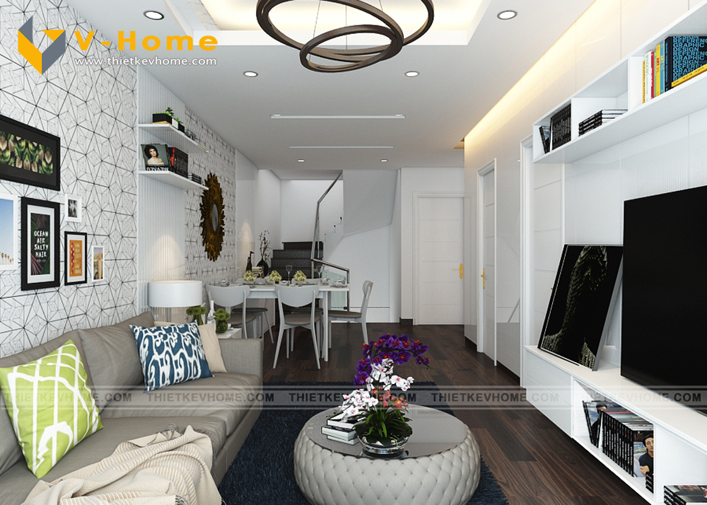 Phòng khách được chăm chút và nhấn nhá bới bức tường được ốp gỗ Acrylic. Gỗ Acrylic là gỗ có bề mặt bóng, có sự phản chiếu tăng độ sang trọng cho ngôi nhà, đồng thời cũng dễ dàng cho việc dọn dẹp, lau chùi vệ sinh.