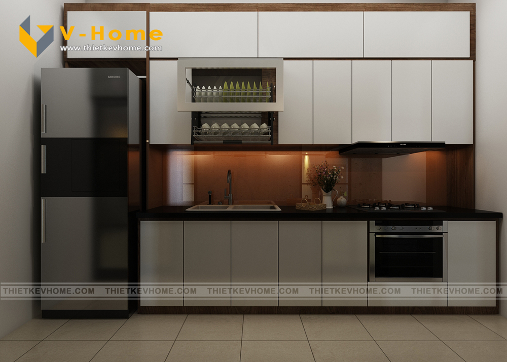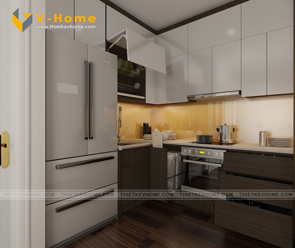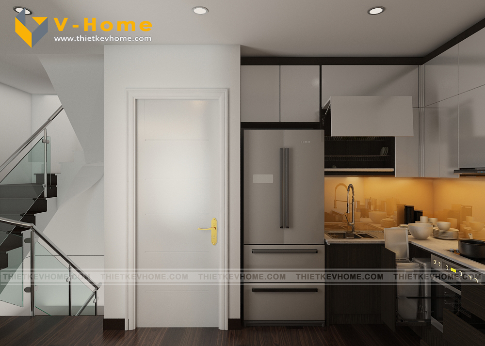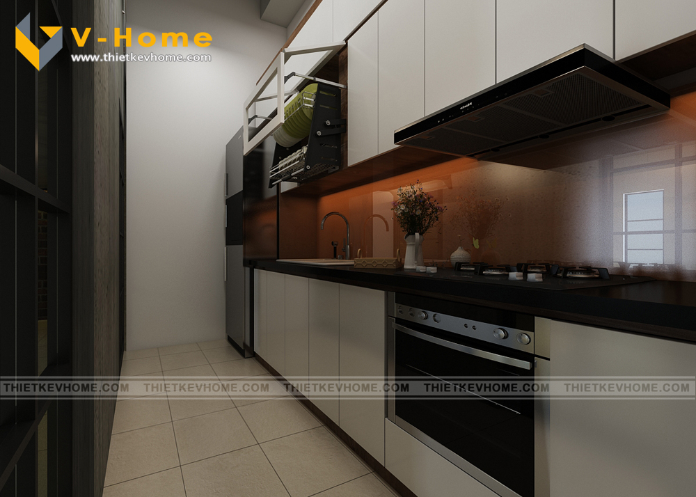 Thiết kế bếp ăn phong cách hiện đại, Kiến trúc sư VHome thiết kế không quá rộng rãi, chỉ thiết kế không gian vừa đủ tiện ích, vừa đủ công năng. Bếp ăn được thiết kế với máy hút mùi hiện đại, đảm bảo không khí trong lành và sạch sẽ.