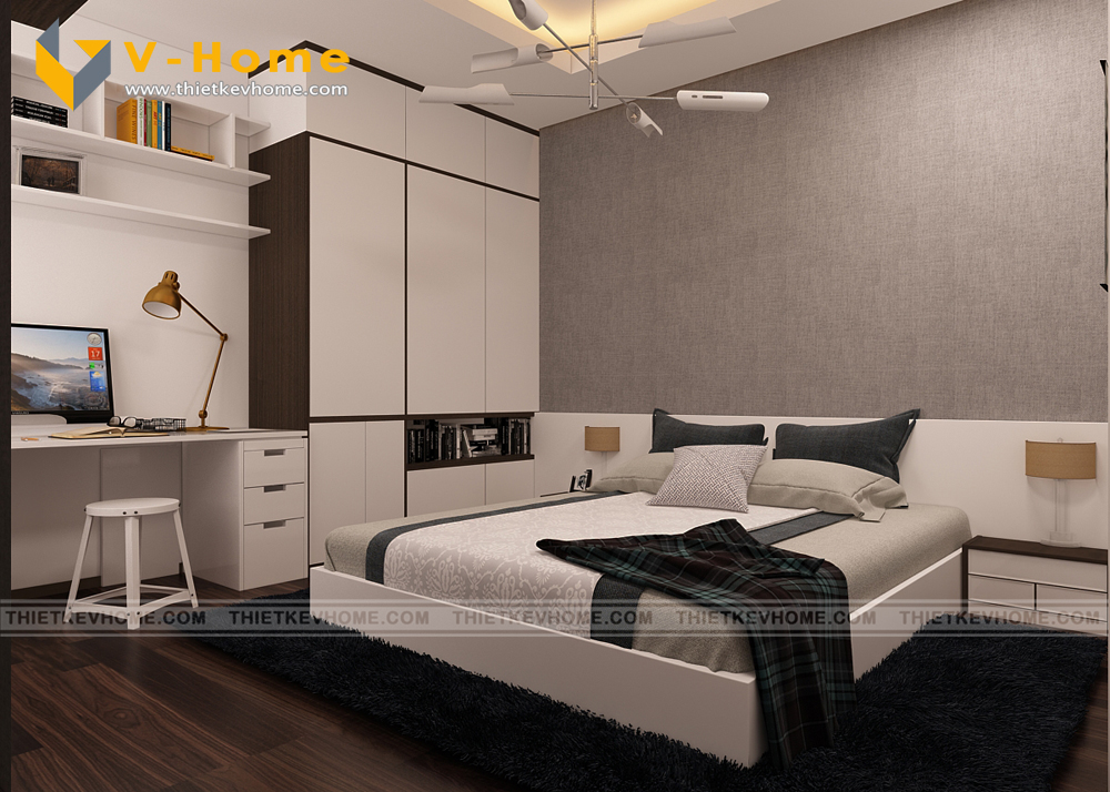Thiết kế phòng ngủ đơn giản nhưng tinh tế với tone màu trắng chủ đạo kết hợp màu gỗ trầm tĩnh, gợi sự gần gũi mà thanh lịch.