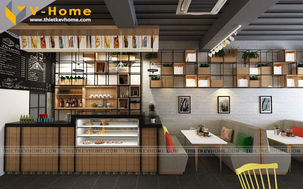 Thiết kế bếp cửa hàng được kiến trúc sư VHome thiết kế biệt lập, để tránh ảnh hưởng tới khách hàng bởi mùi thức ăn, đồng thời tạo không gian riêng cho nhân viên nhà bếp.