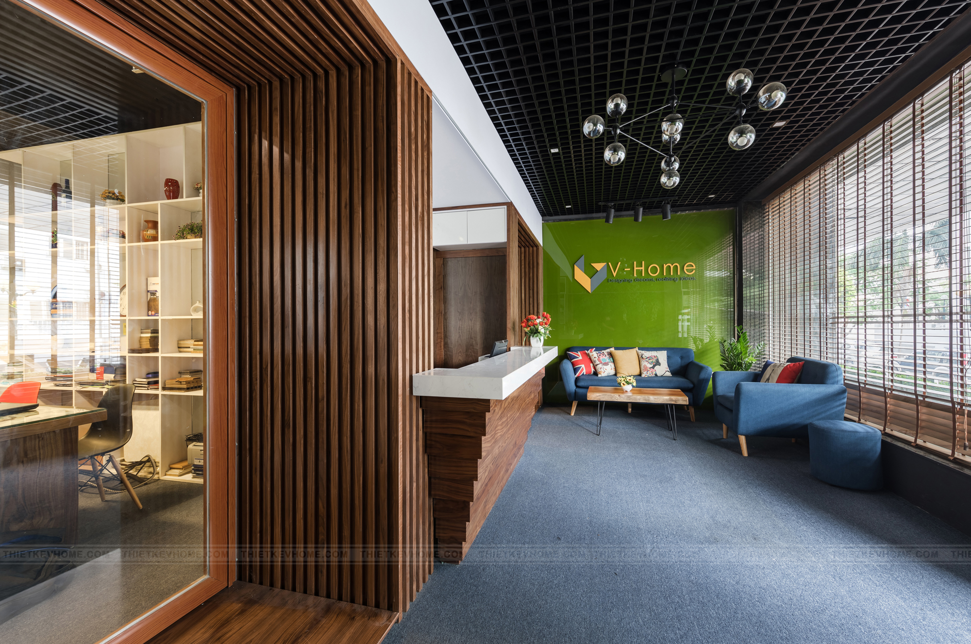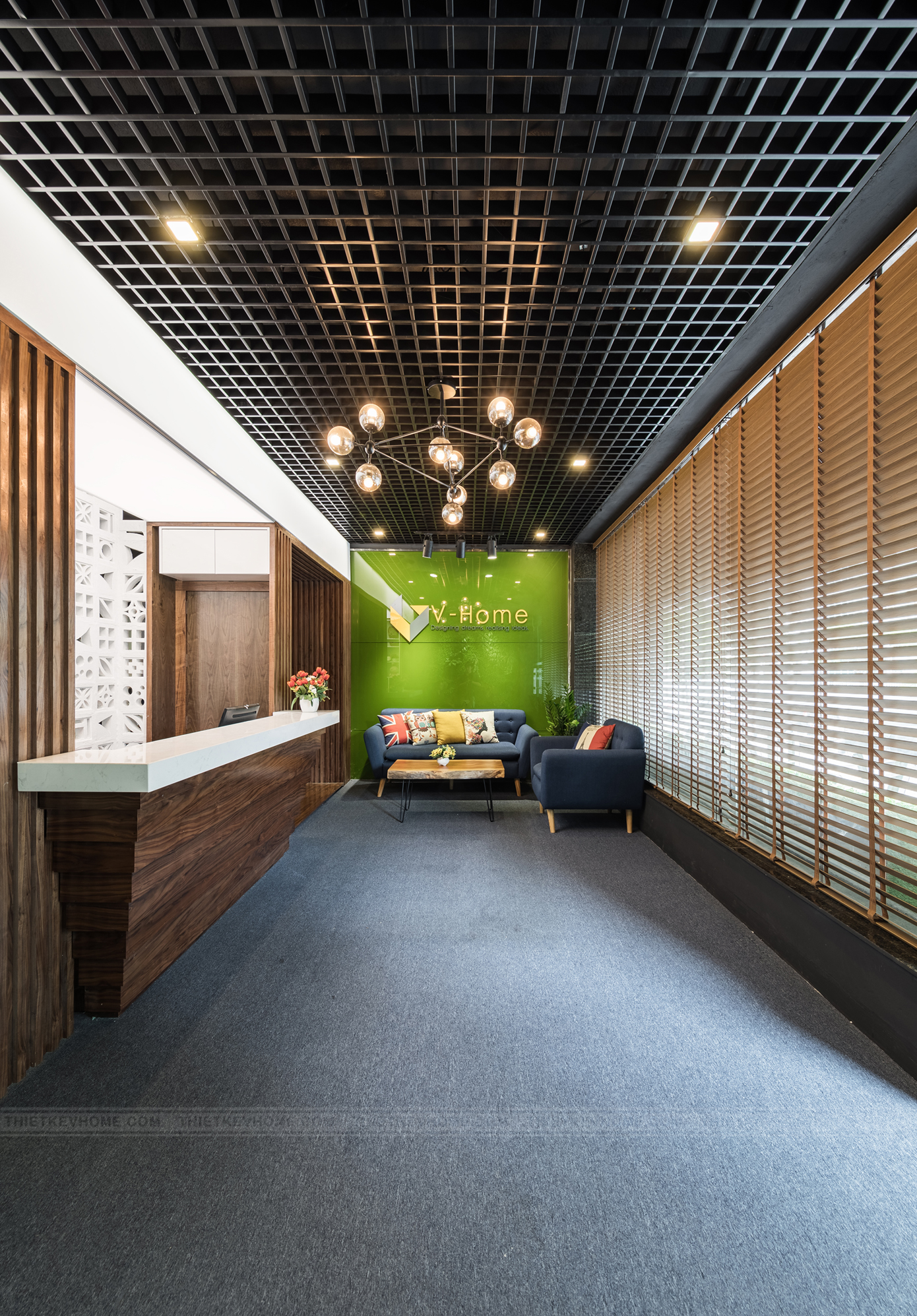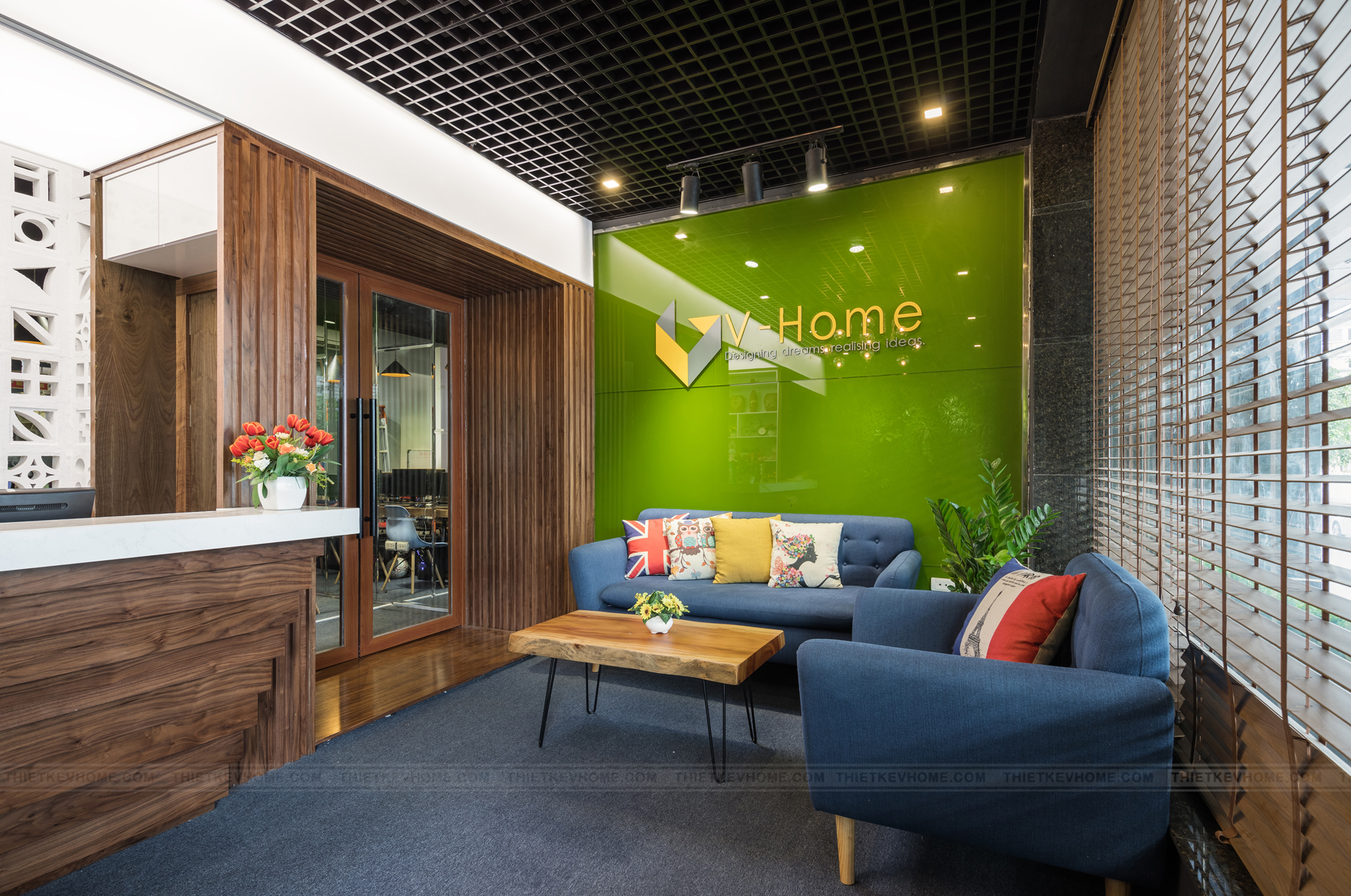 Không gian tiếp khách được thiết kế rộng rãi, ấn tượng, hòa quyện giữa các sắc màu của nội thất. Thiết kế nội thất phá bỏ những giới hạn, quy chuẩn sử dụng trần thạch cao thông thường, mà thay vào nó là trần nhôm sơn đen kết hợp với trần xuyên sáng đã tạo sự dấu ấn khác biệt cho những khách hàng đã đặt chân tới văn phòng V-Home.