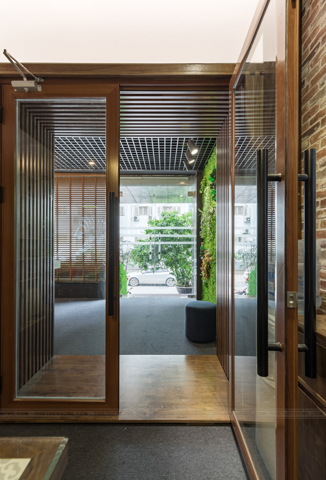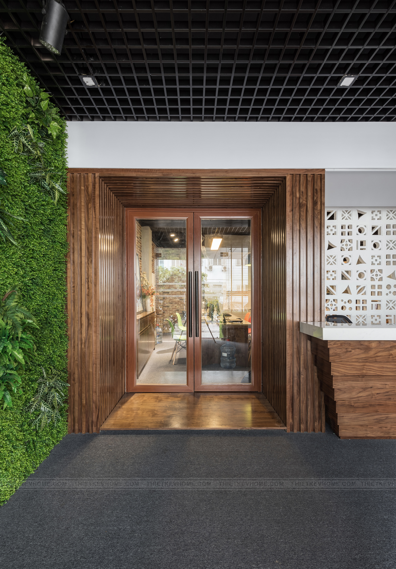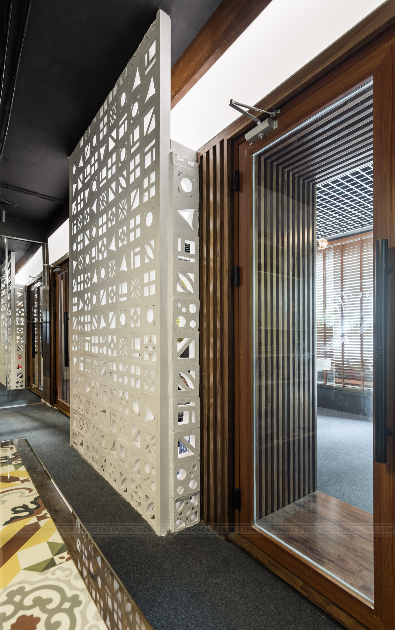 Diện tích văn phòng công ty V-Home không quá lớn nhưng lại cần đầy đủ các phòng chức năng, vì vậy thay vì xây dựng các bức tường thô cứng thì kiến trúc sư V-Home đã sử vật liệu gạch thông gió trong thi công nội thất vừa tạo điểm nhấn cho không gian làm việc, vừa mang lại sự thông thoáng và ánh sáng cho khu vực phía trong.