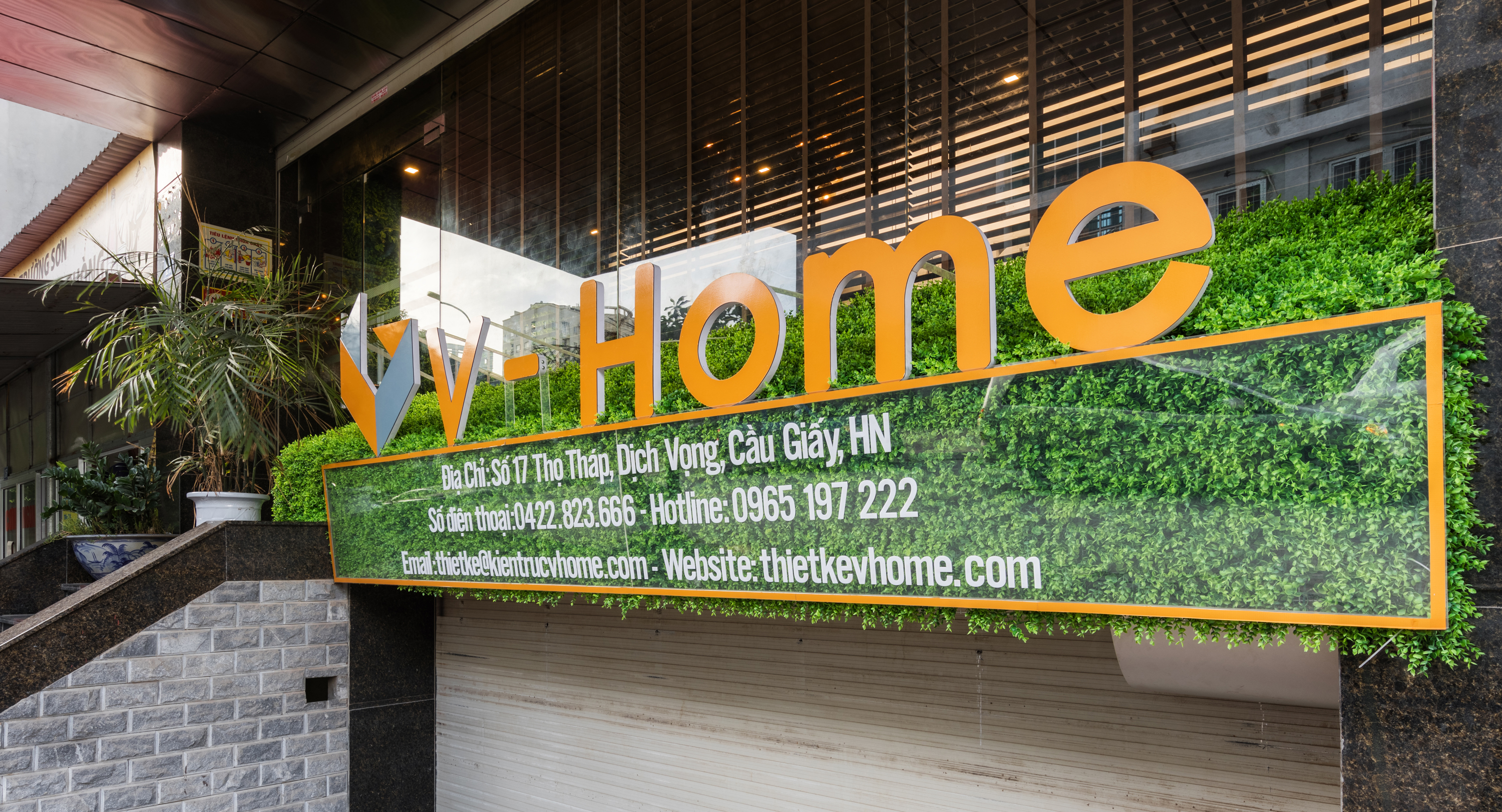 Logo và thương hiệu V-Home nổi bật trên thảm cỏ màu xanh, giúp doanh nghiệp nhận diện thương hiệu, tạo khoảng cách khác biệt và giúp khách hàng dễ dàng tìm ra địa chỉ của một công ty thiết kế và thi công nội – ngoại thất uy tín, chuyên nghiệp.
