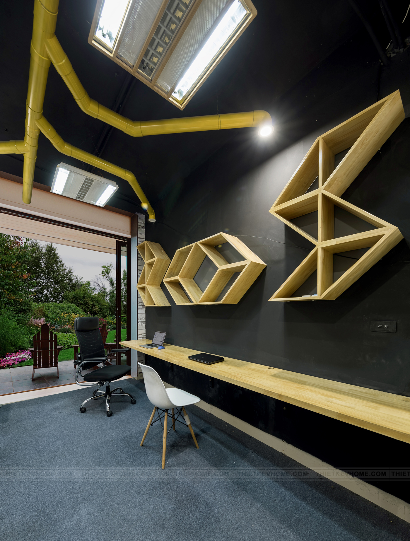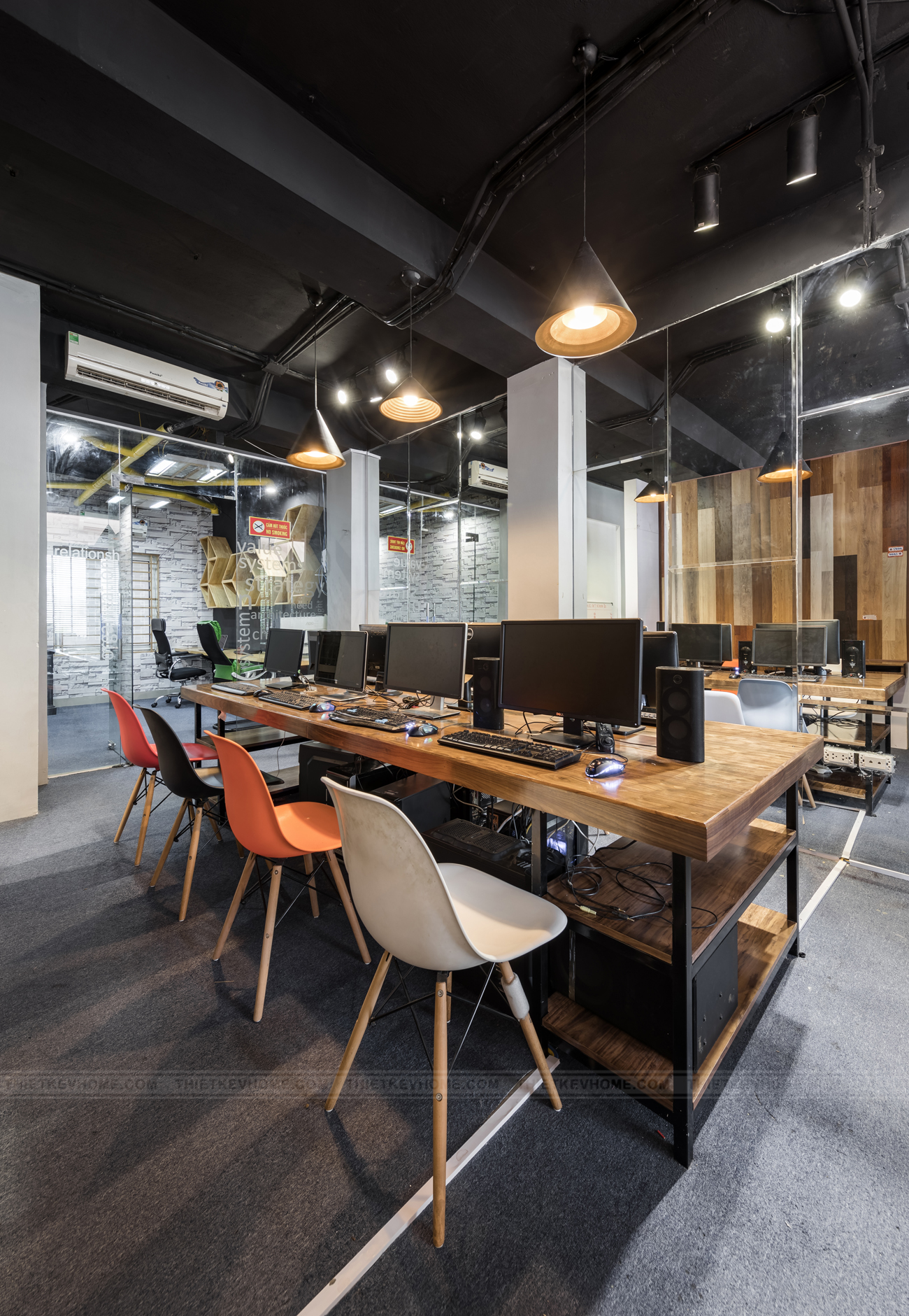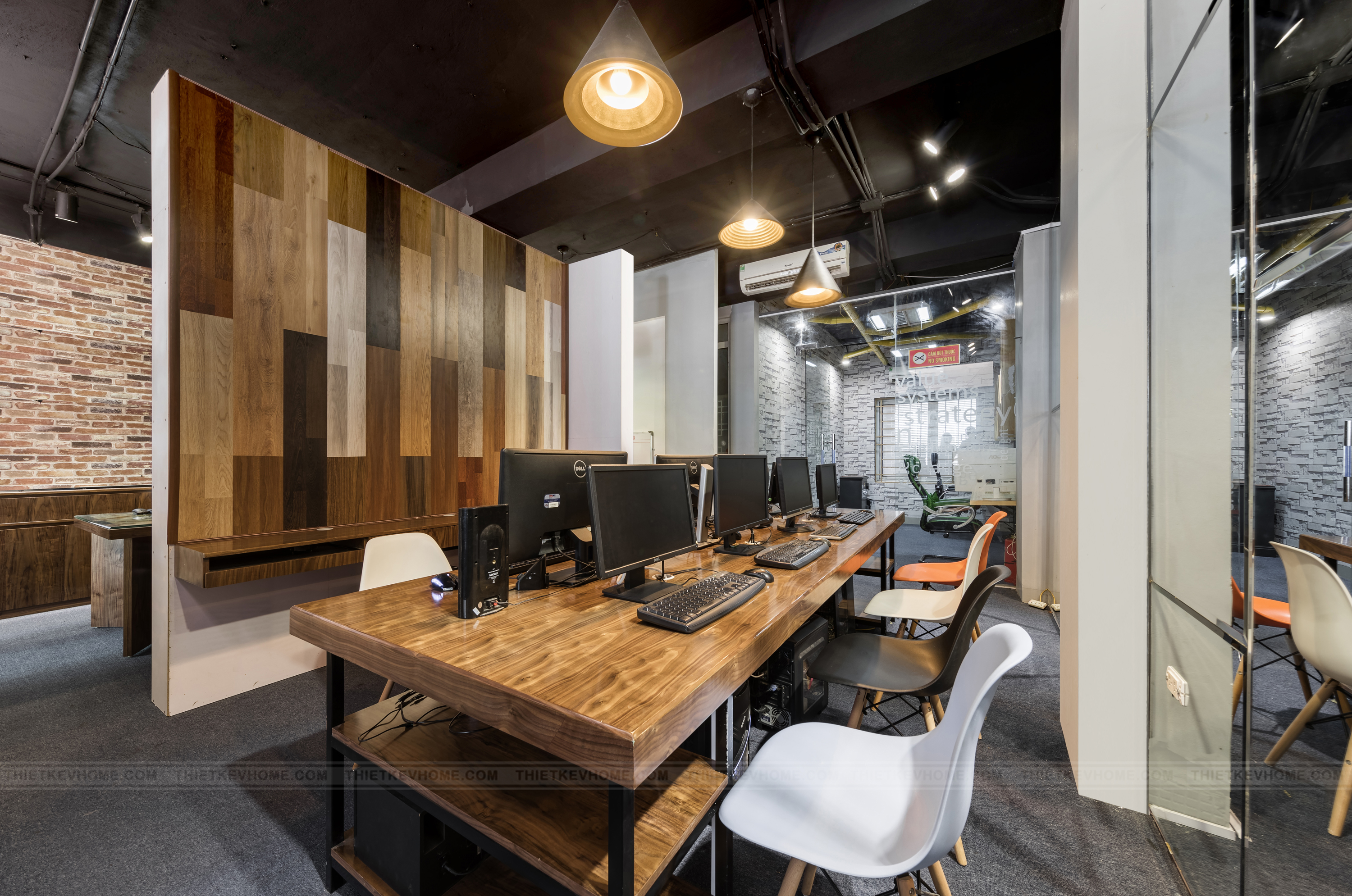 Phòng thi công được kiến trúc sư bố trí gọn gàng, ngăn nắp, thiết kế bàn dạng thanh ngang nằm sát mép tường giúp không gian trở nên thoáng và rộng hơn nhiều, giúp tiết kiệm diện tích sử dụng cho văn phòng. Phong cách Industrial cũng là một đặc điểm khá nổi bật và quan trọng ở không gian này, màu đen của sơn tường khẳng định nét cá tính riêng, độc lập và mạnh mẽ, kết hợp giấy dán tường 3D cùng sắc xanh của cây lá mà màu sắc đã được cân bằng, không còn là cái lạnh lẽo, nhàm chán của sơn tường.