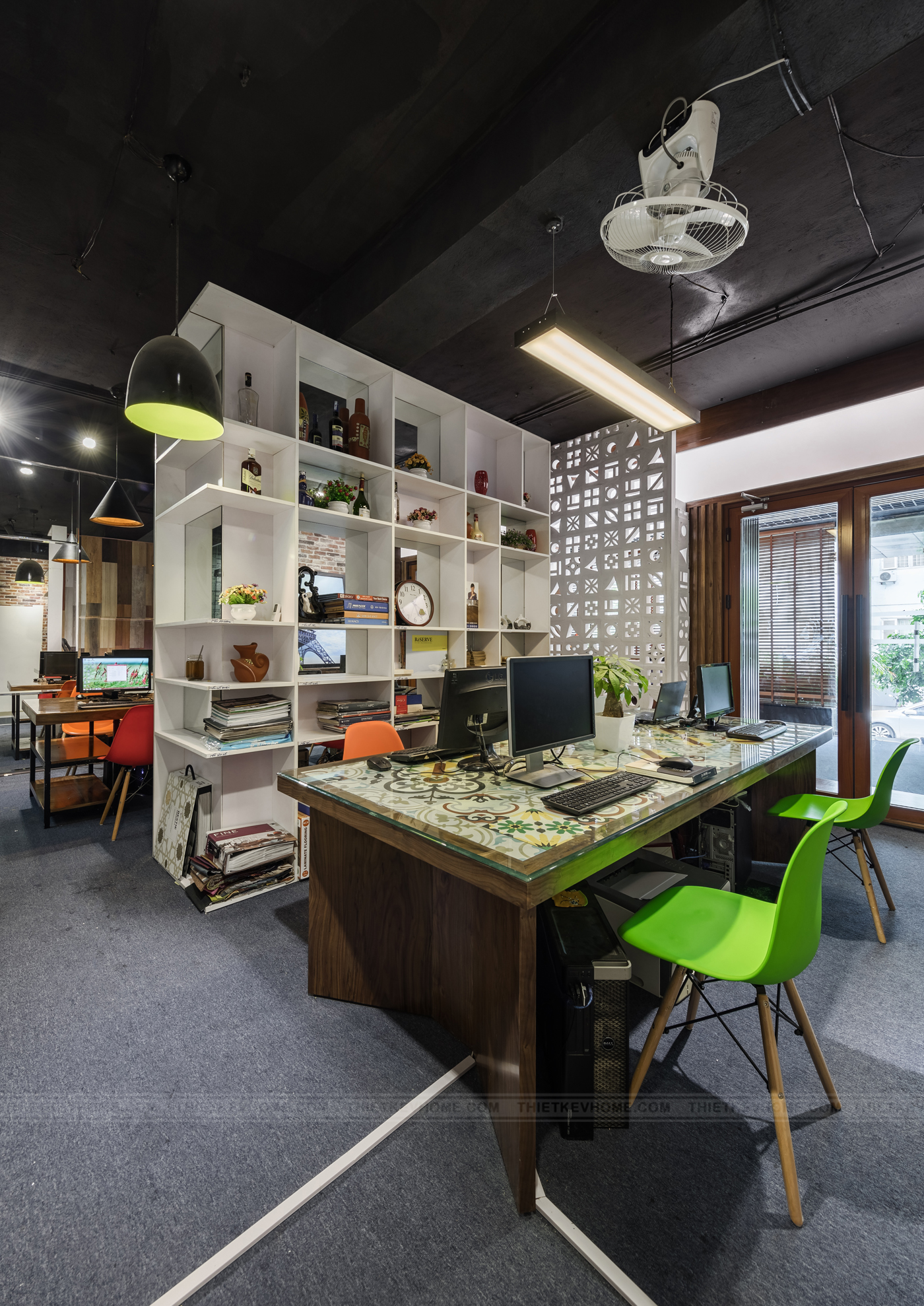 Thiết kế nội thất văn phòng làm việc tạo ra môi trường sinh hoạt năng động, thoải mái cho nhân viên. Phòng kỹ thuật và phòng kinh doanh sử dụng bàn làm việc được trang trí bằng gạch bông đầy màu sắc. Không gian làm việc sử dụng vách ngăn bằng hệ tủ để tài liệu và decor trang trí vừa hài hòa thoáng đãng, vừa tận dụng tối đa diện tích văn phòng.